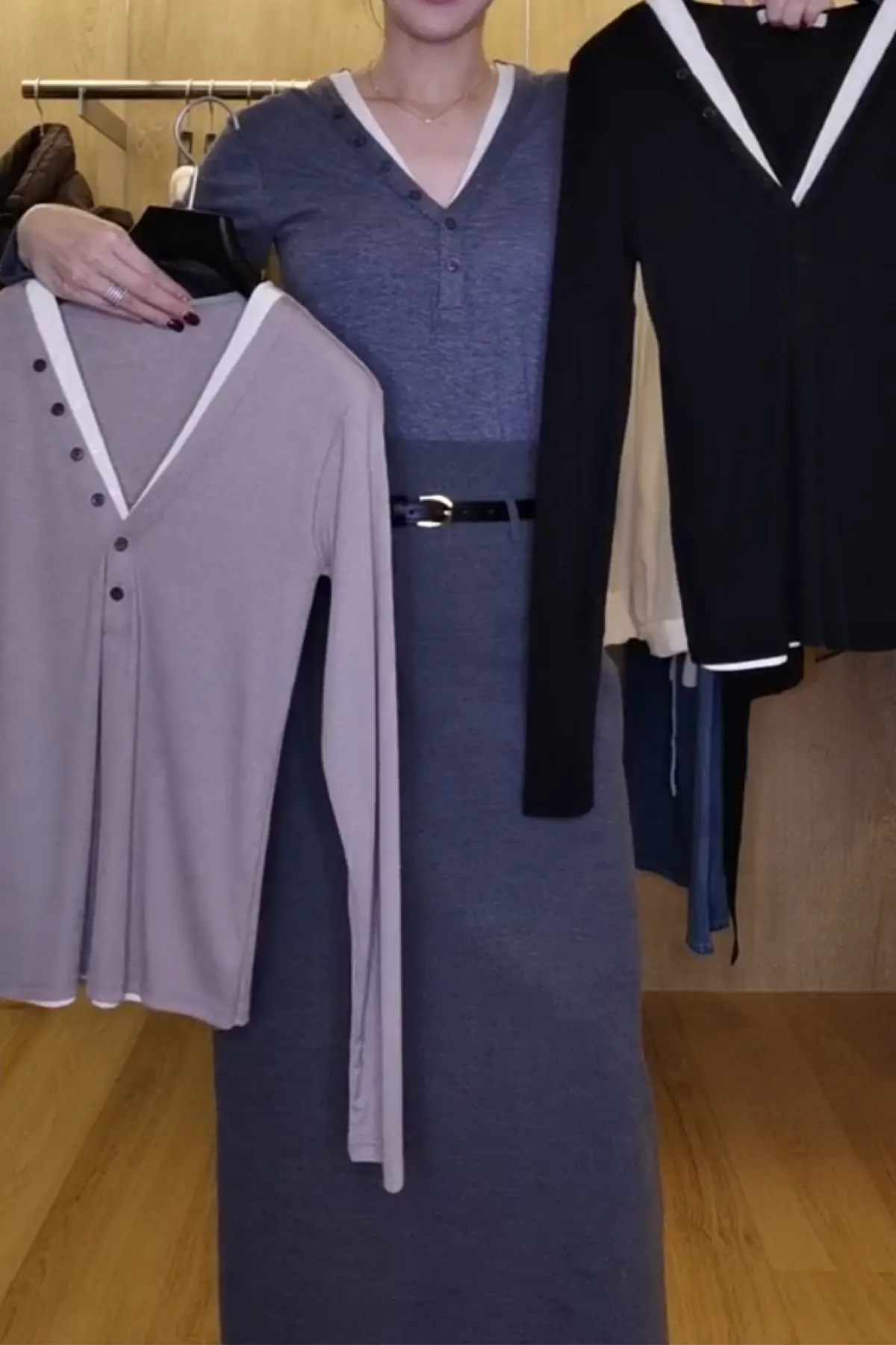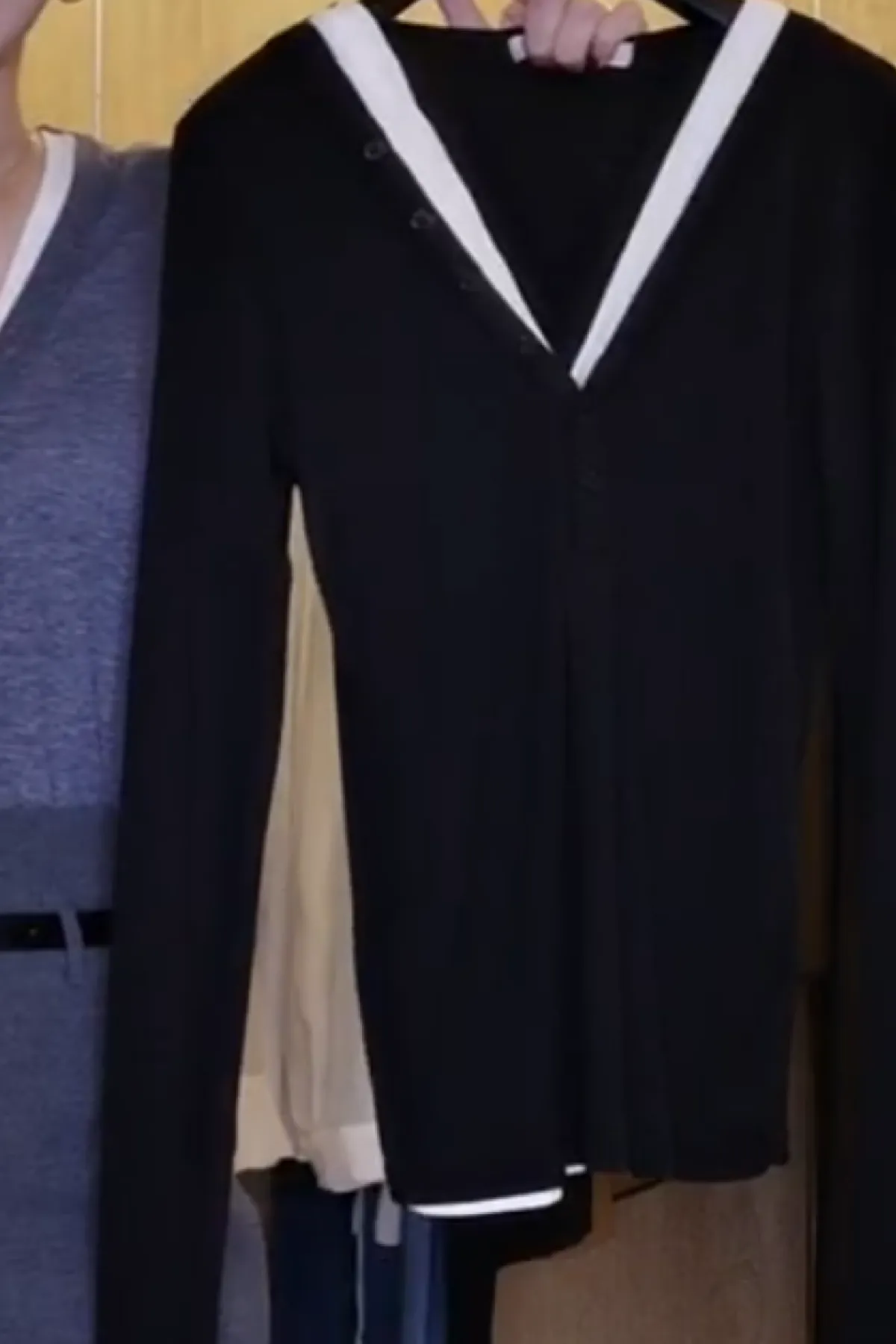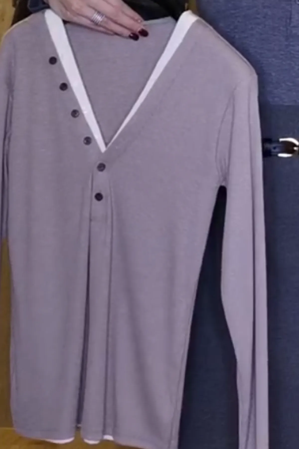 嫘縈V領半排釦雙層T