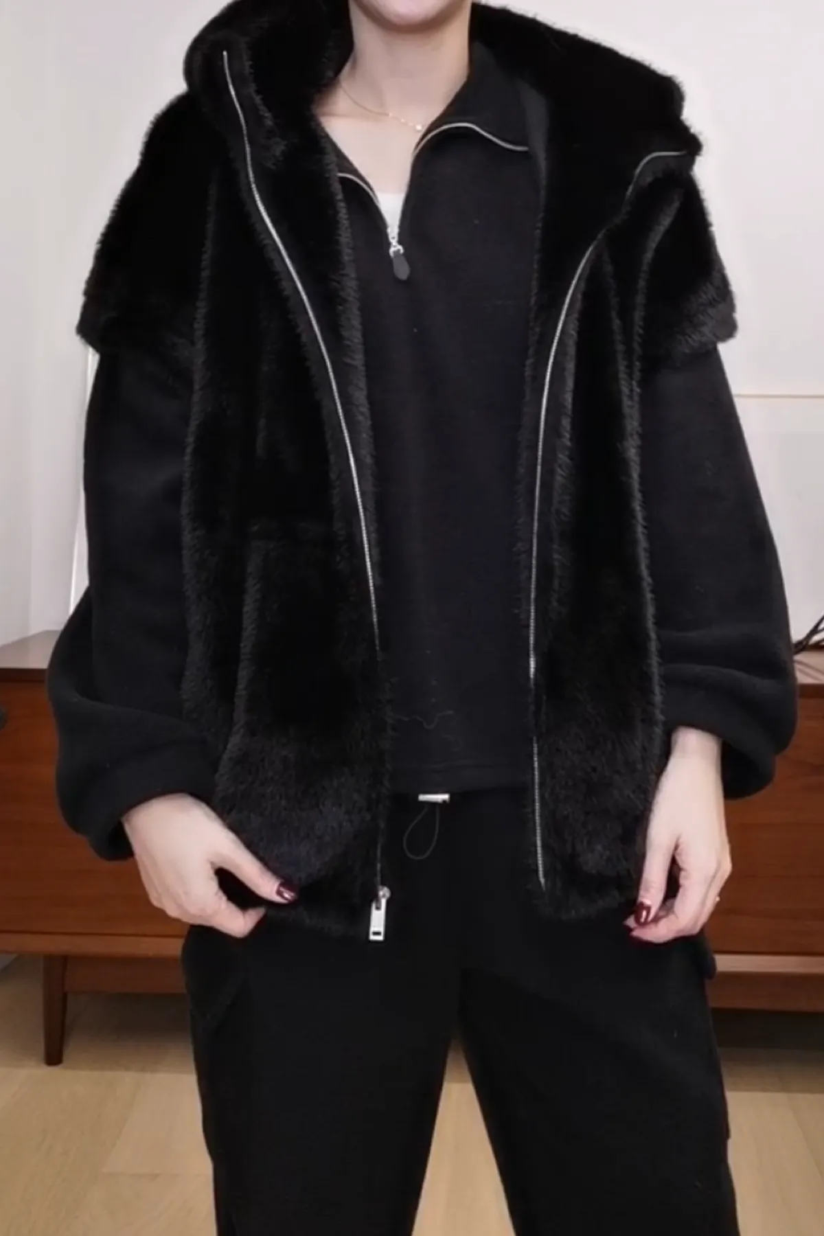 毛毛連帽拉鍊蓋袖背心