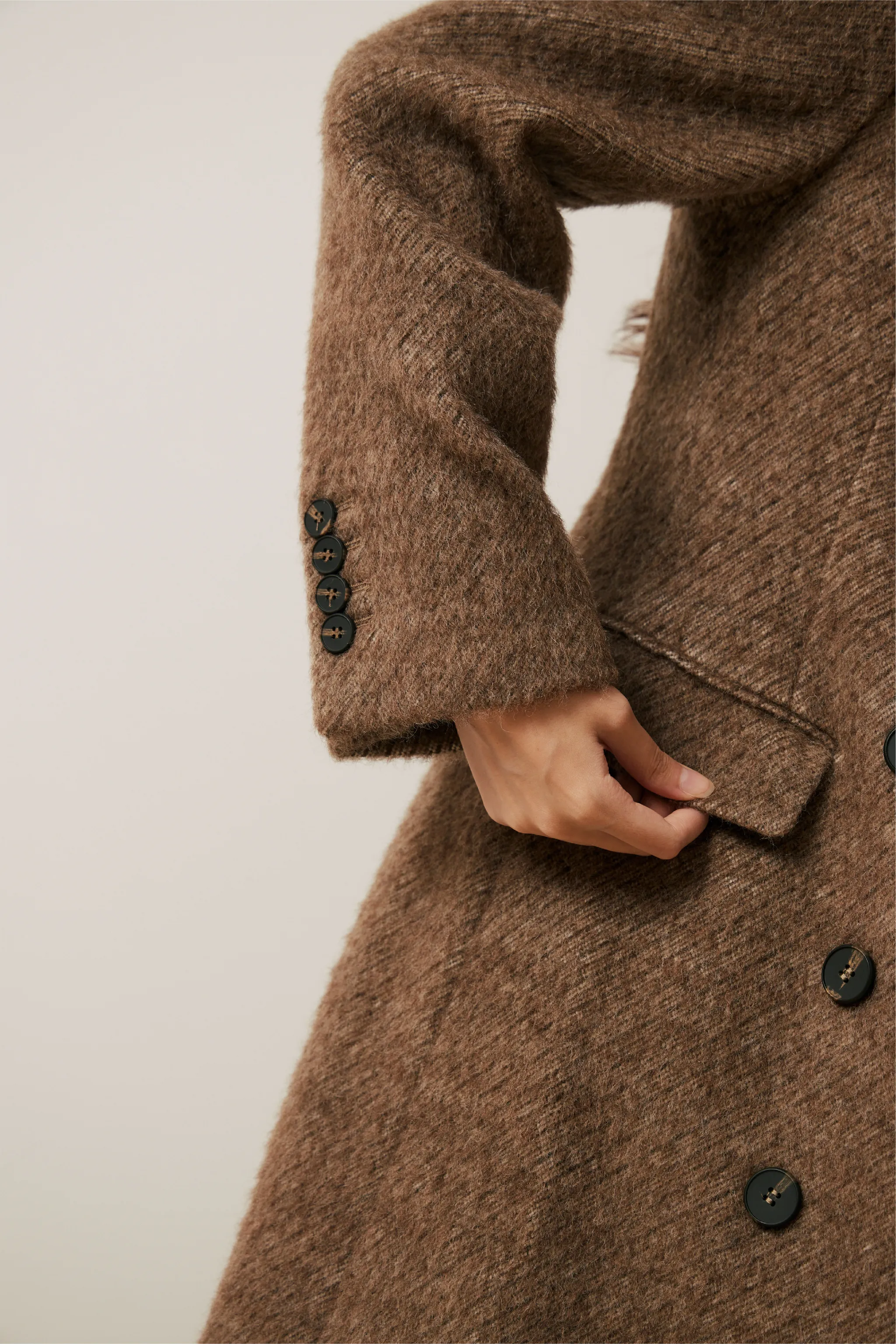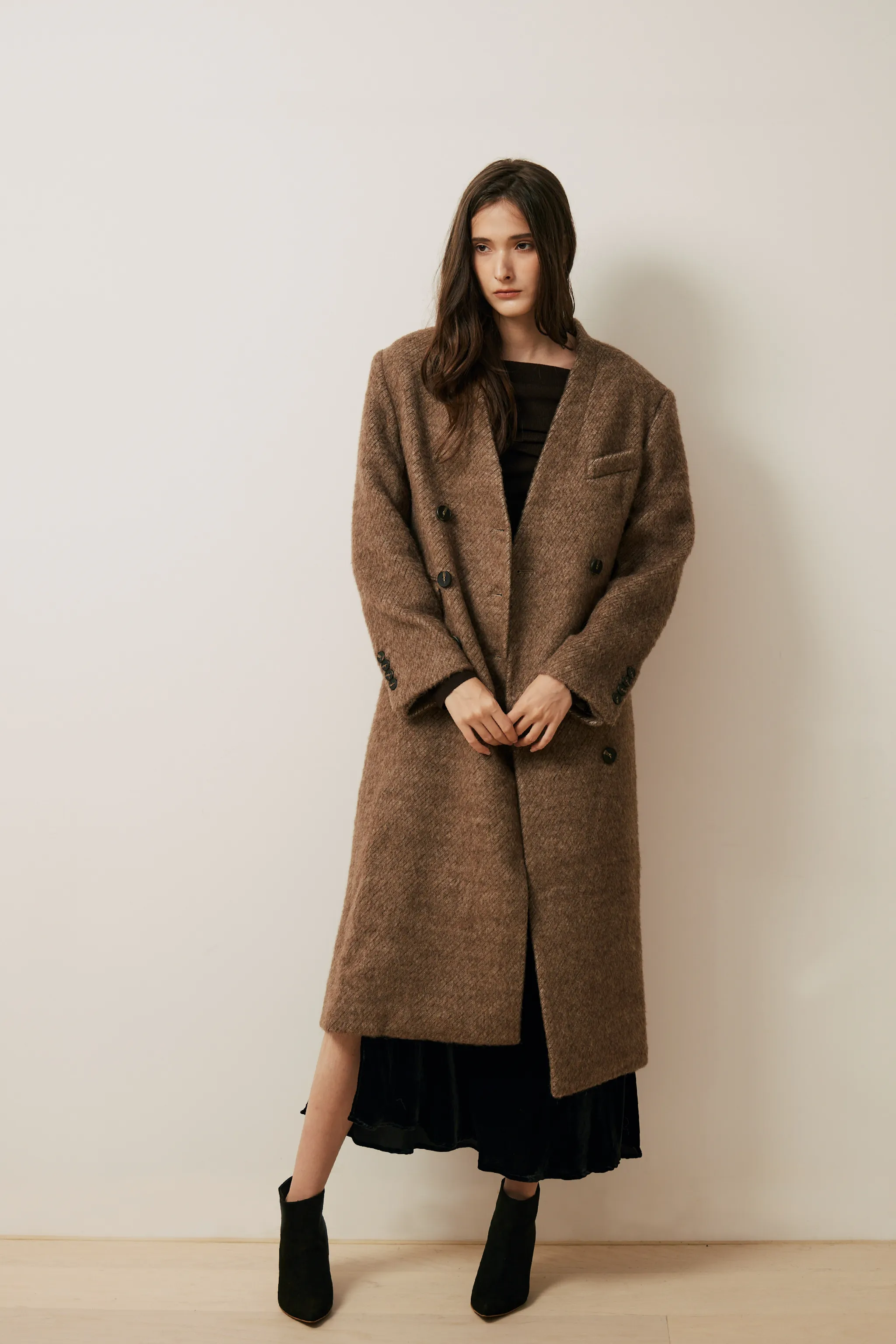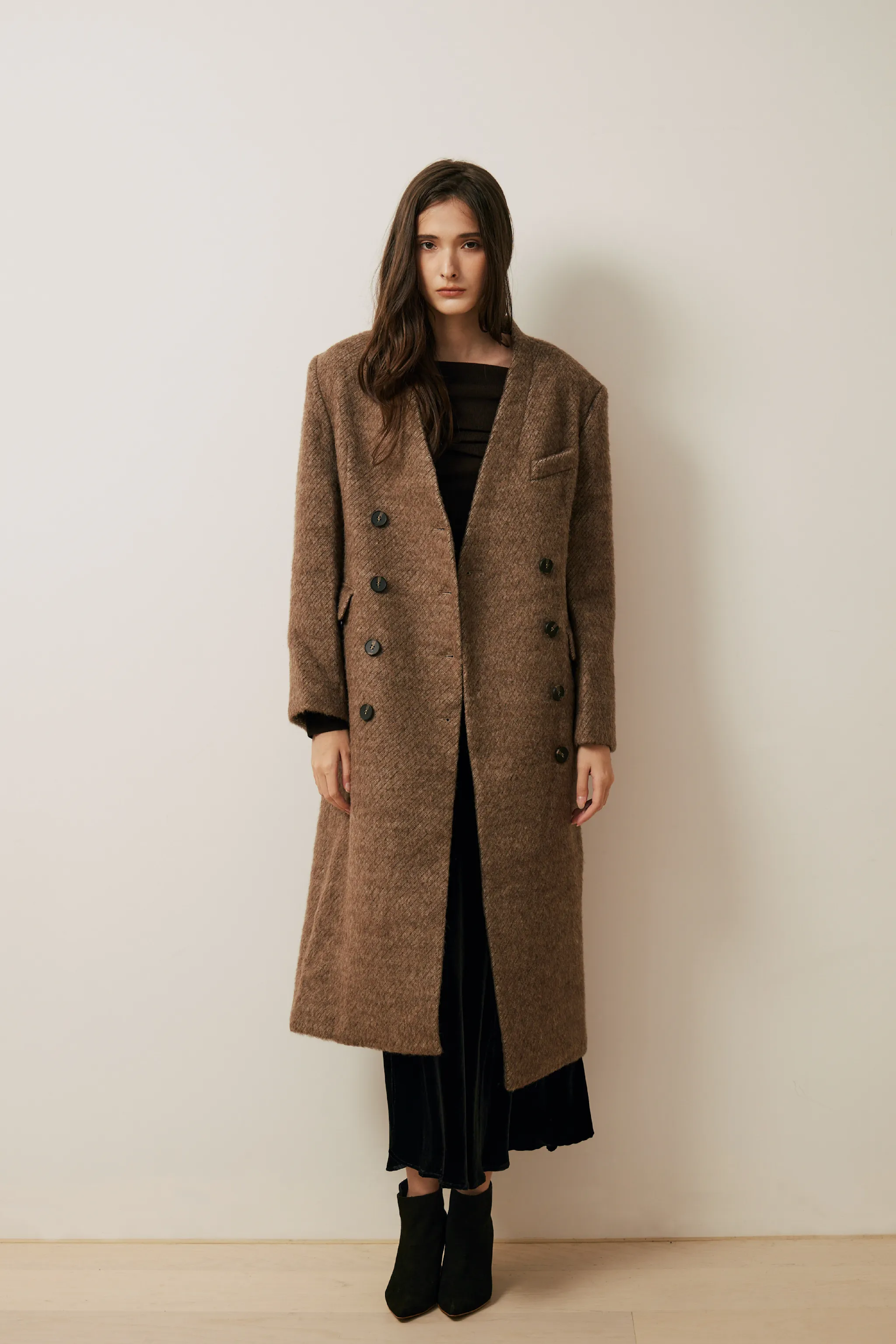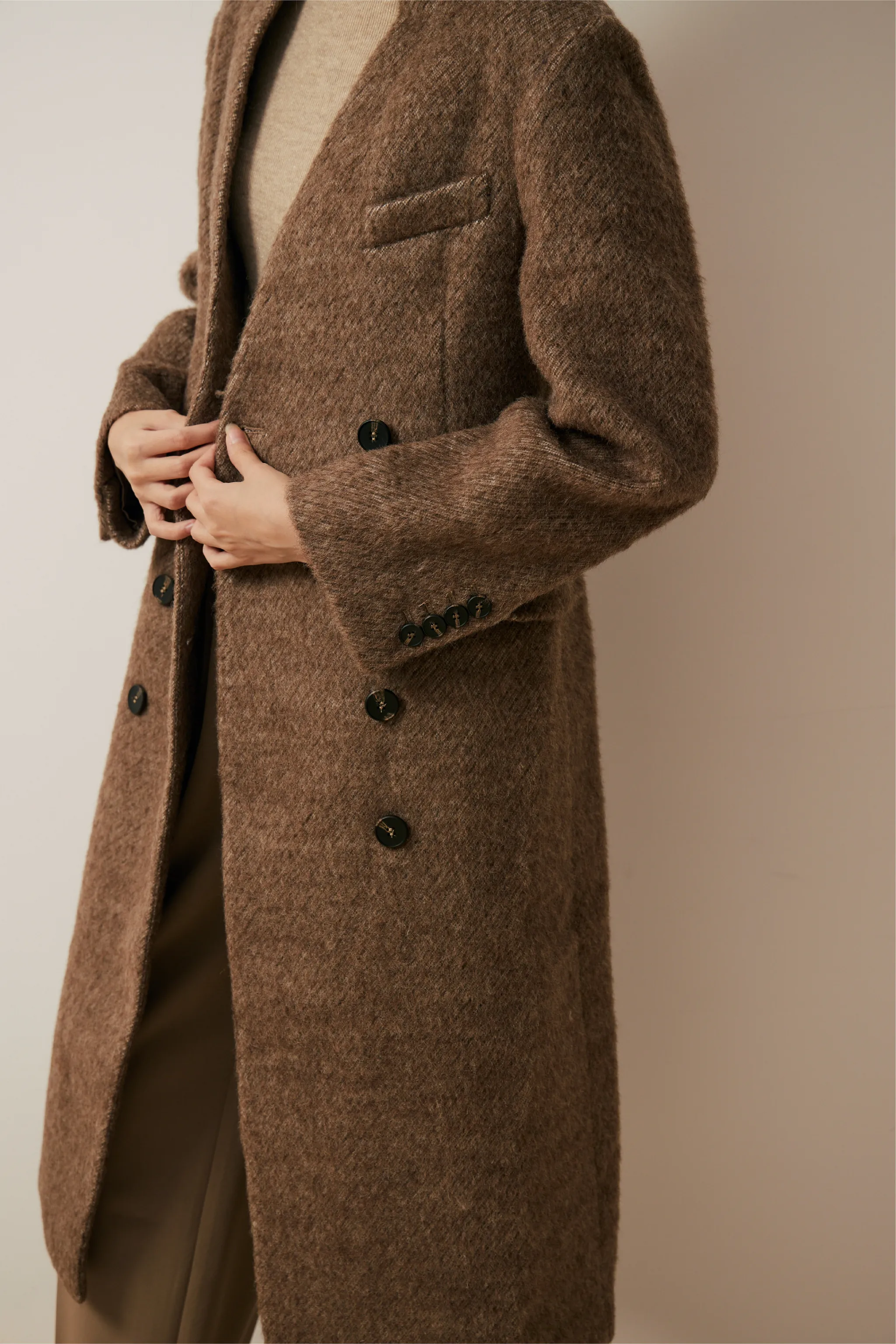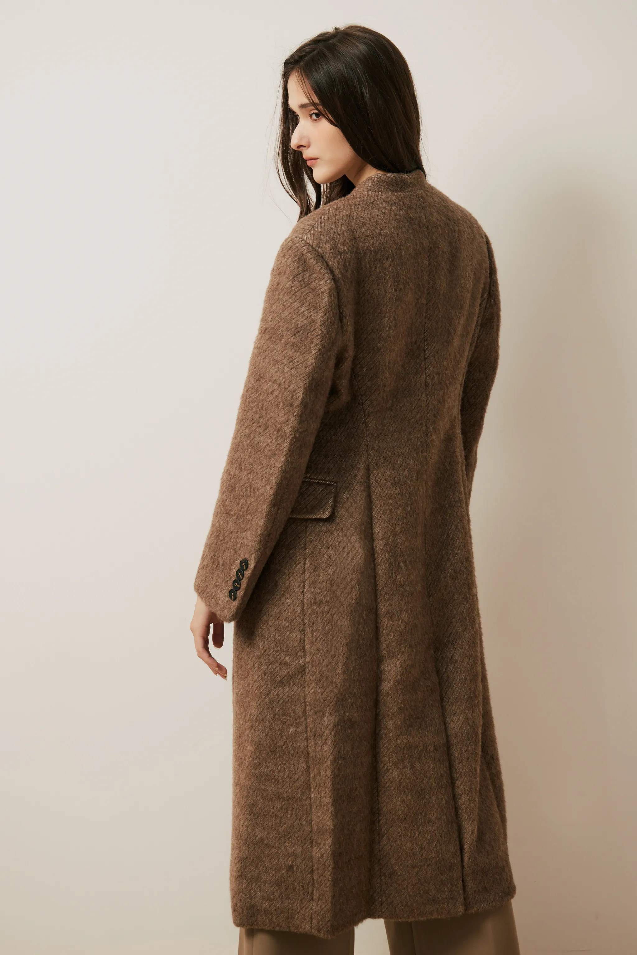 羊毛混織雙排釦無領大衣