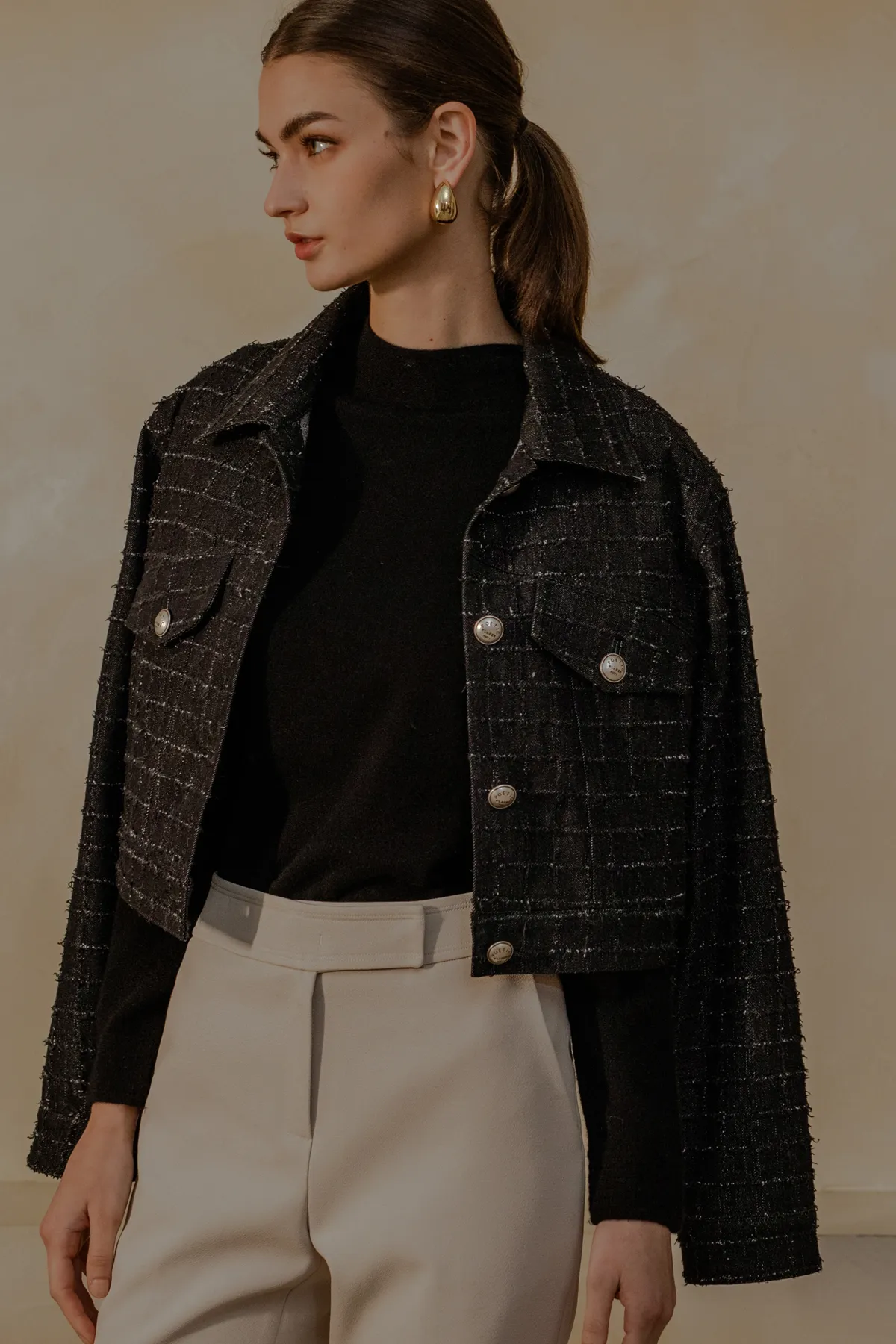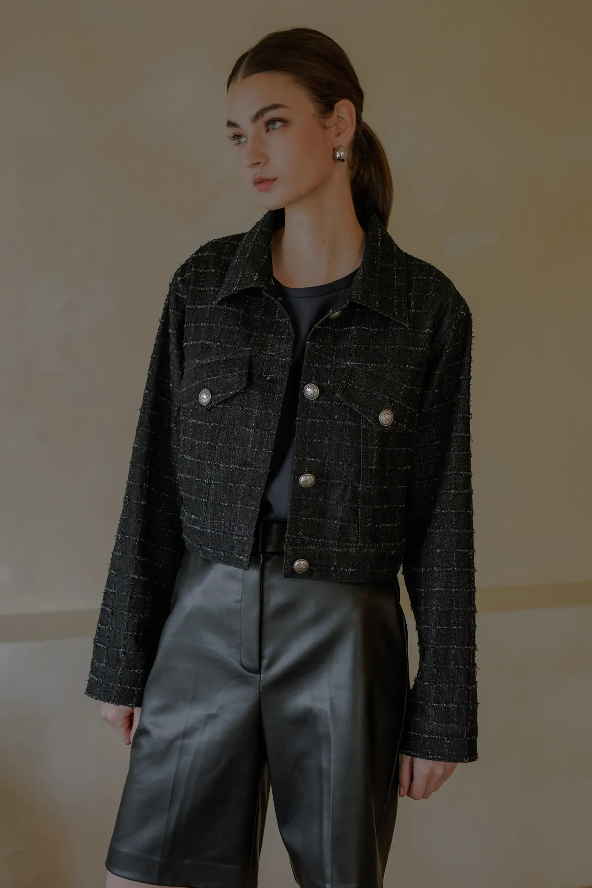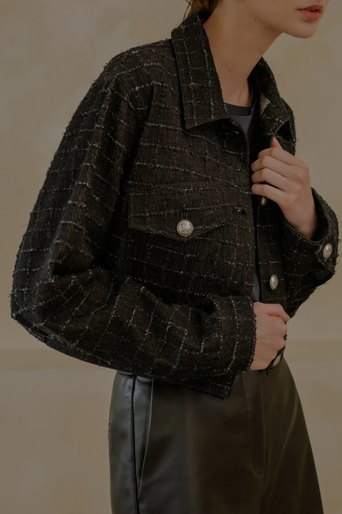 翻領抽鬚格紋短牛仔外套
