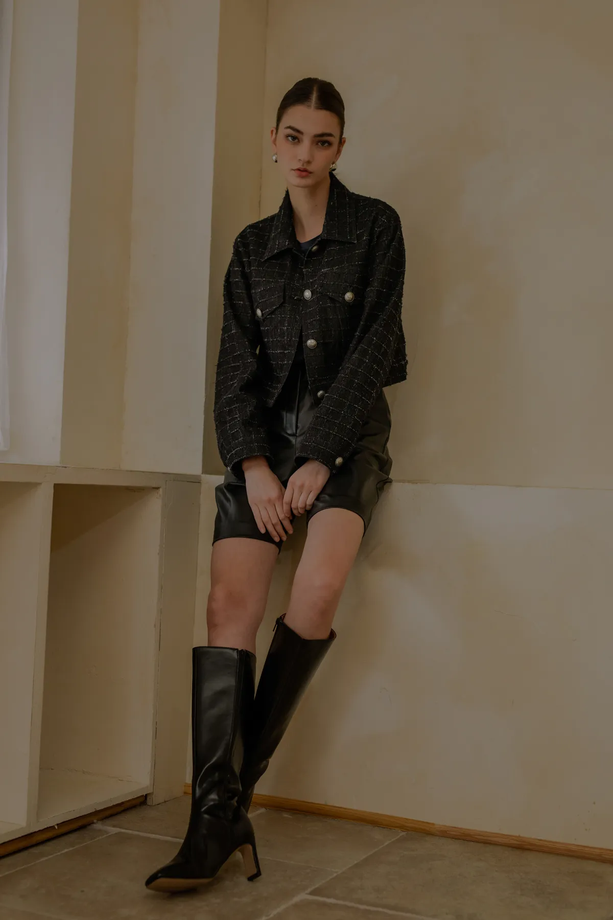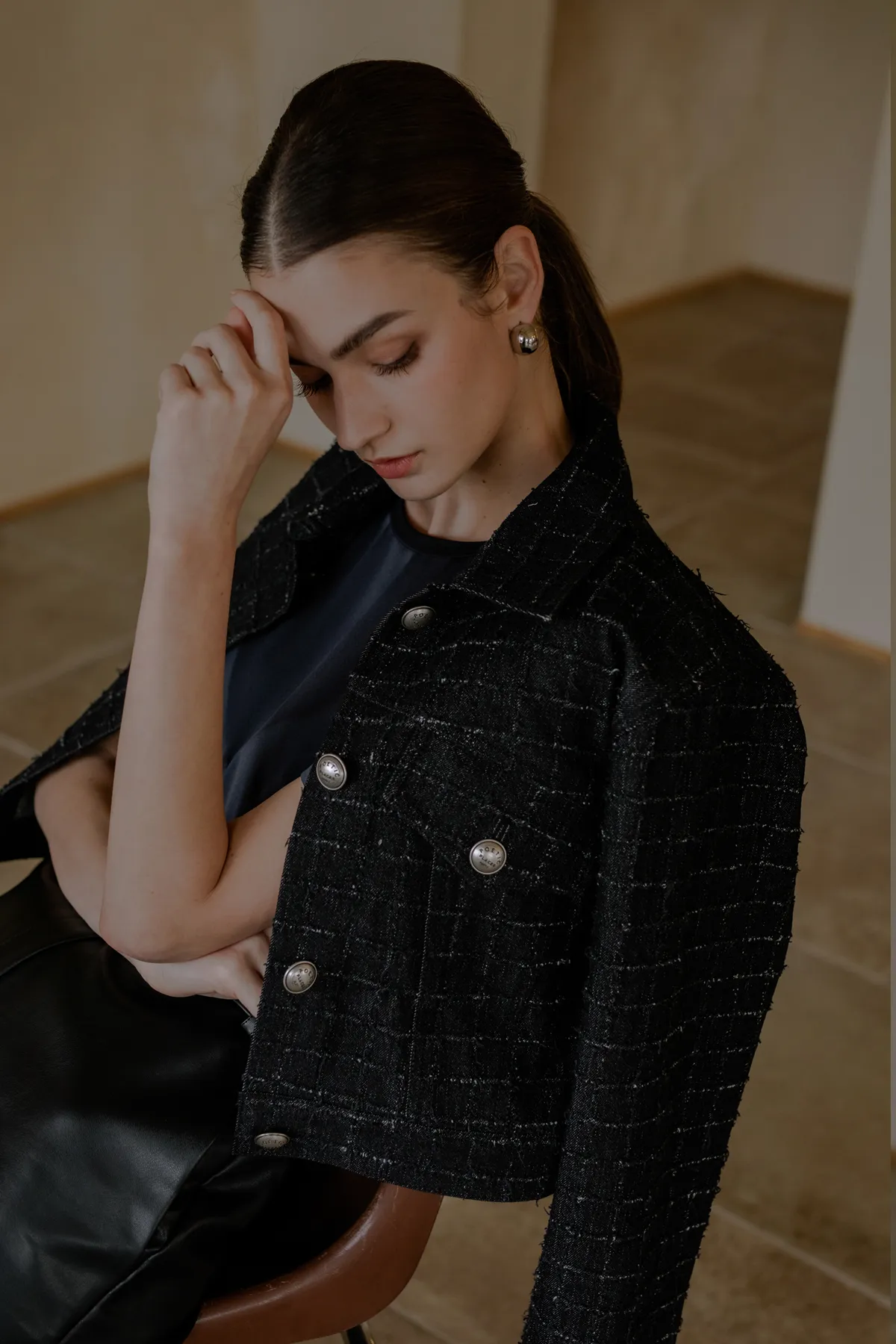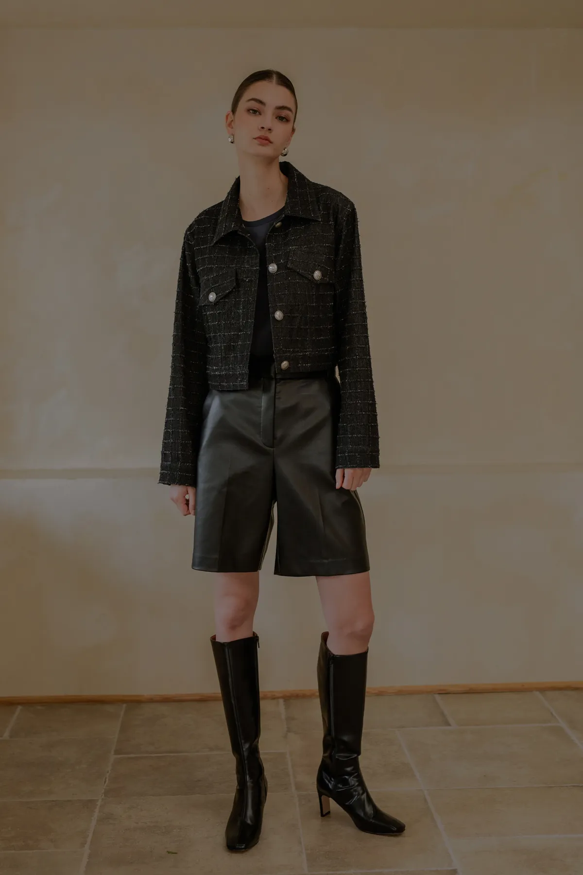 翻領抽鬚格紋短牛仔外套