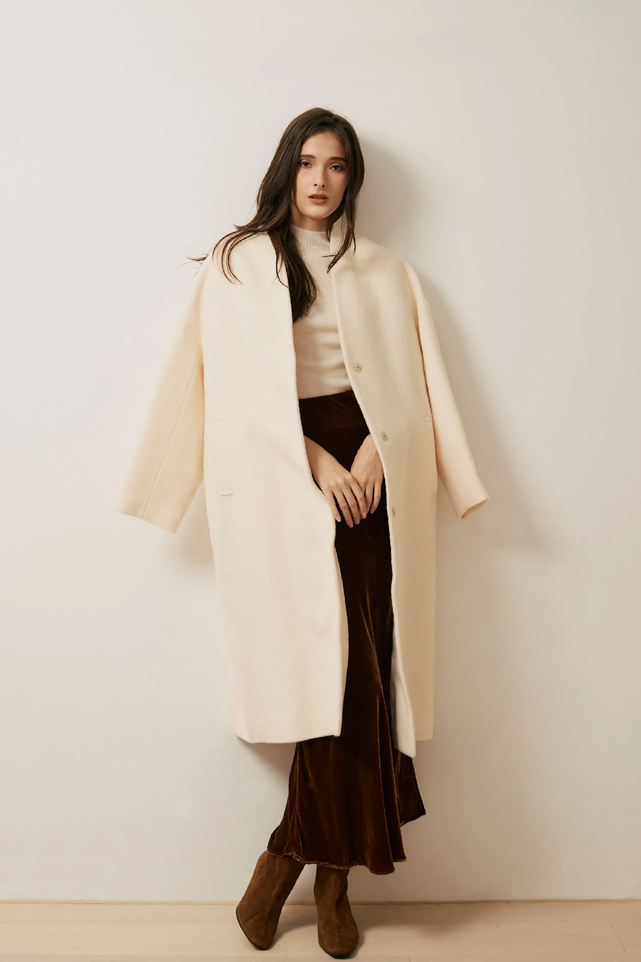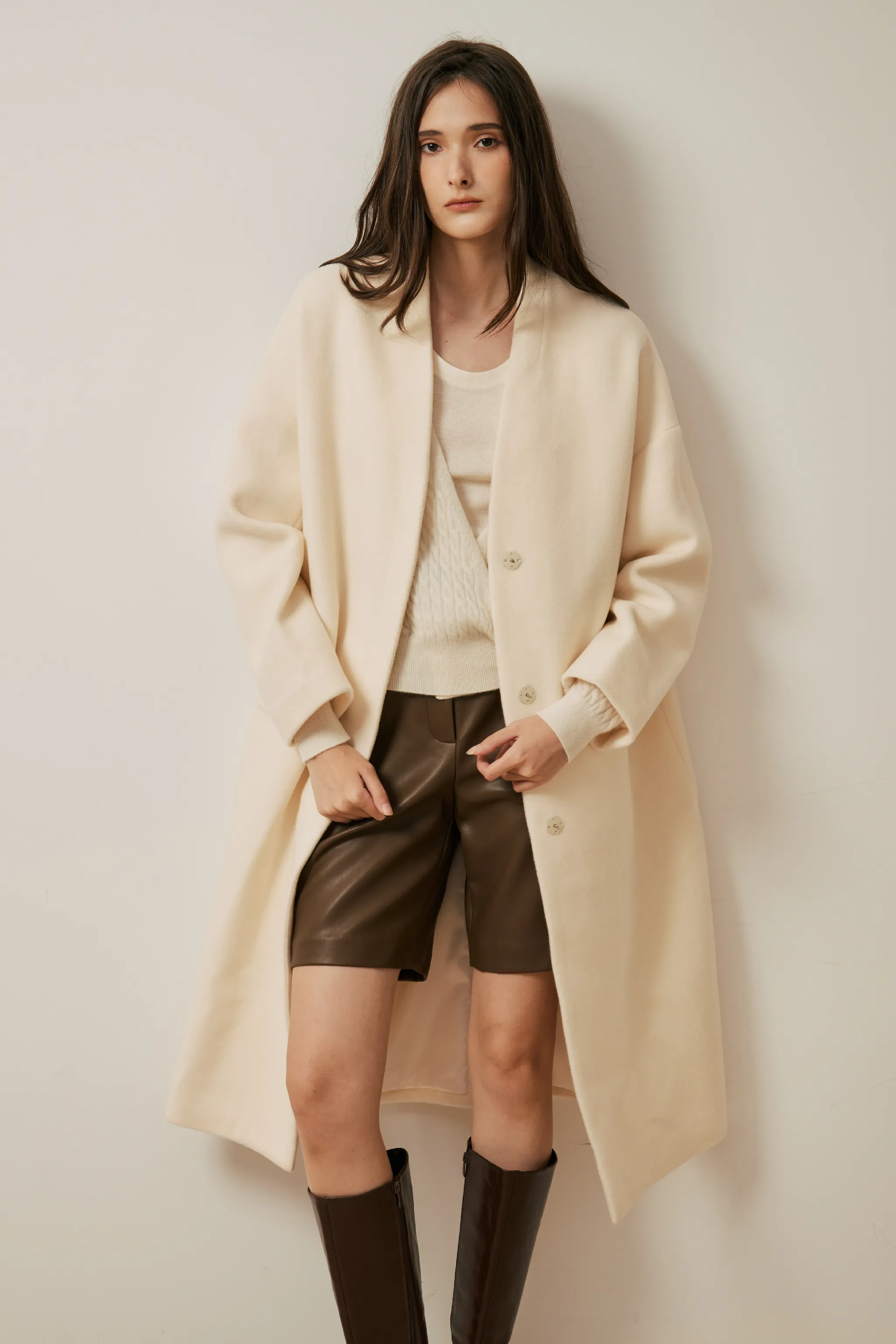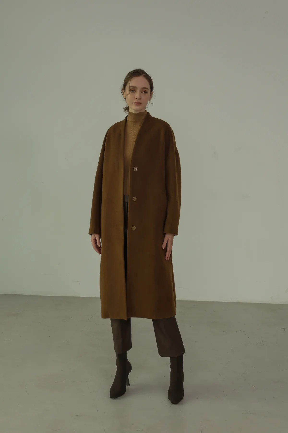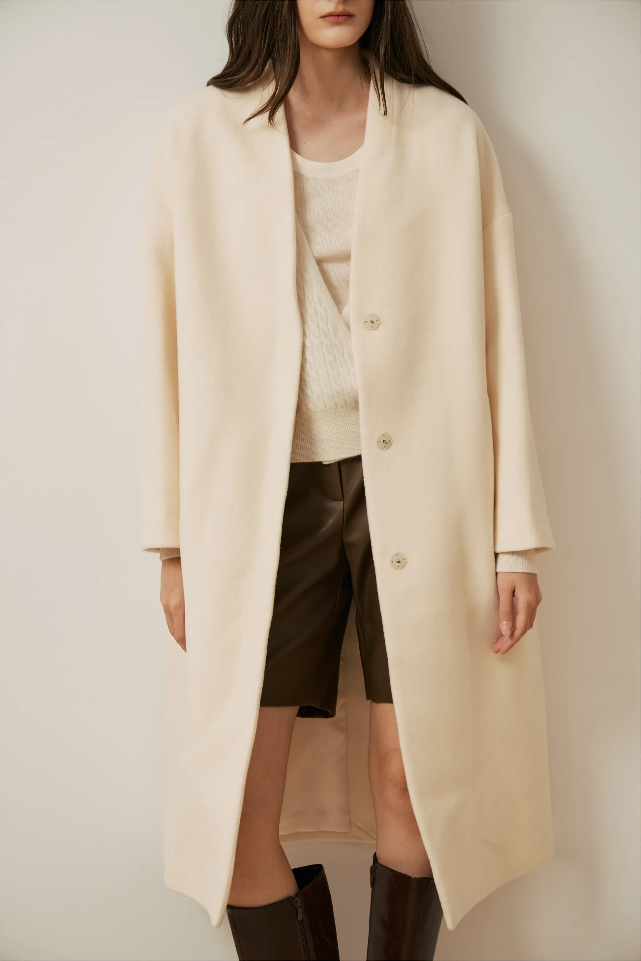 純羊毛無領壓釦長版大衣
