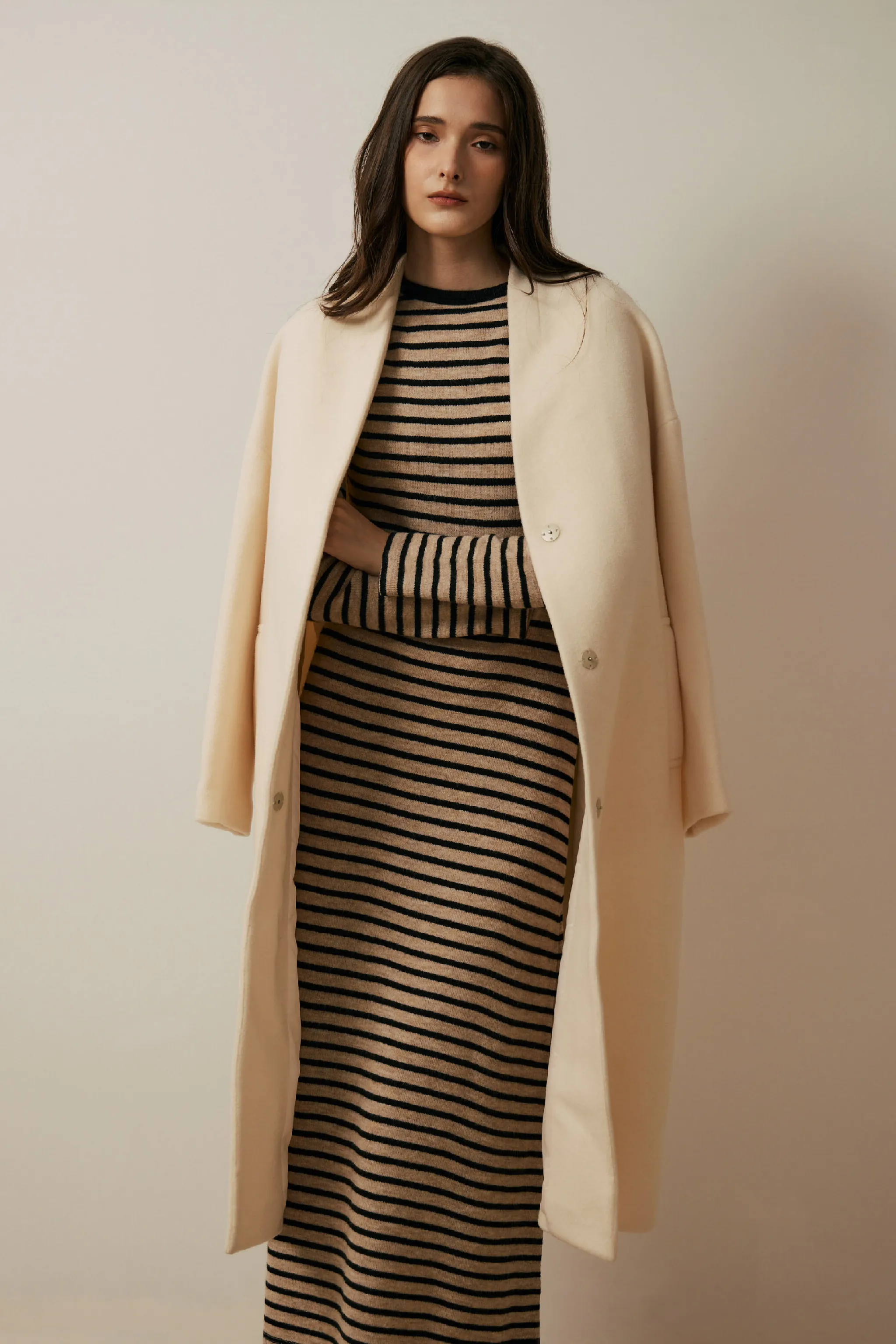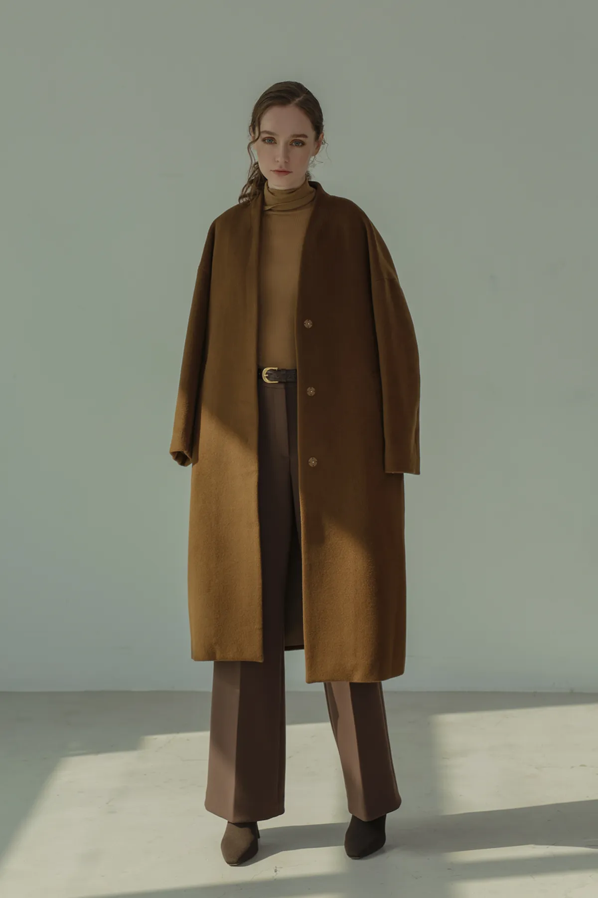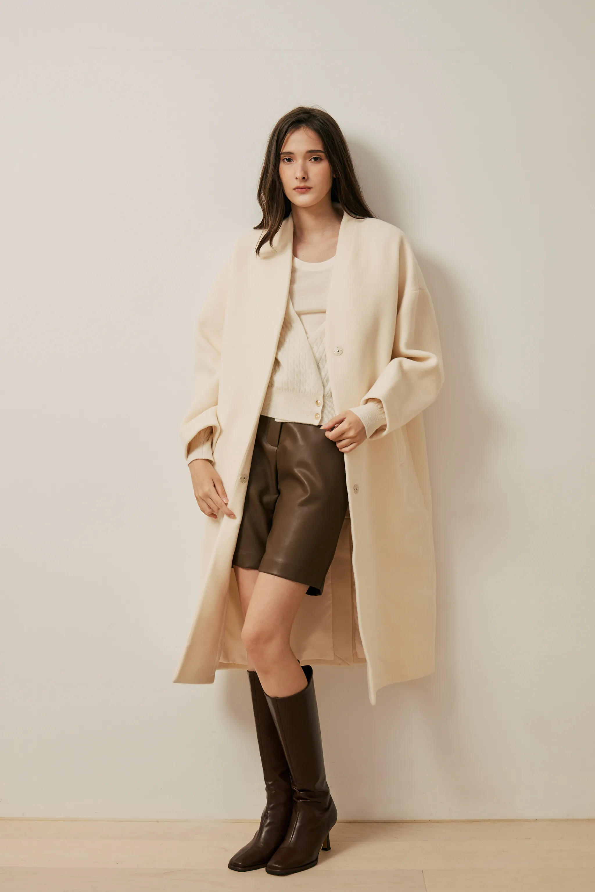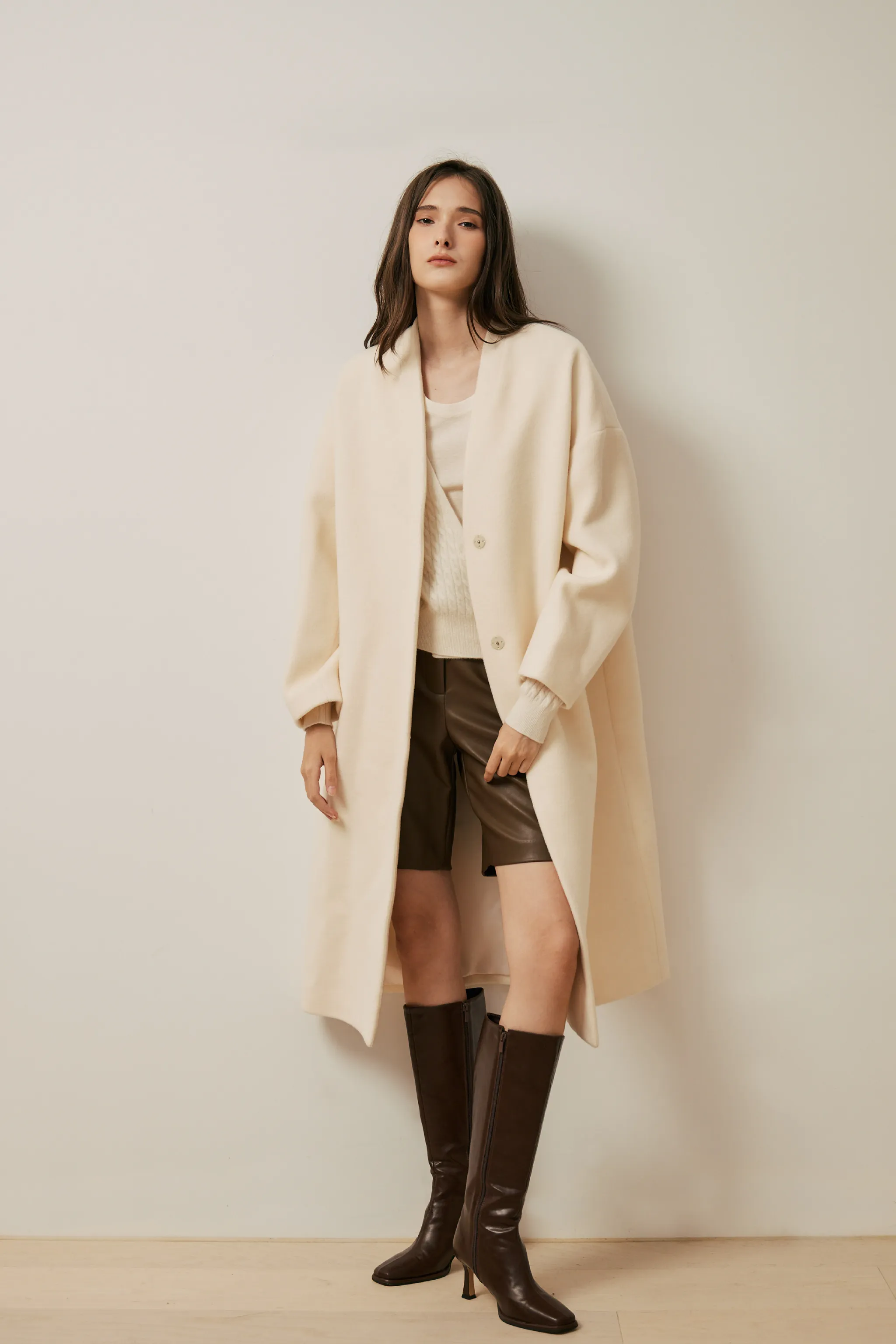 純羊毛無領壓釦長版大衣