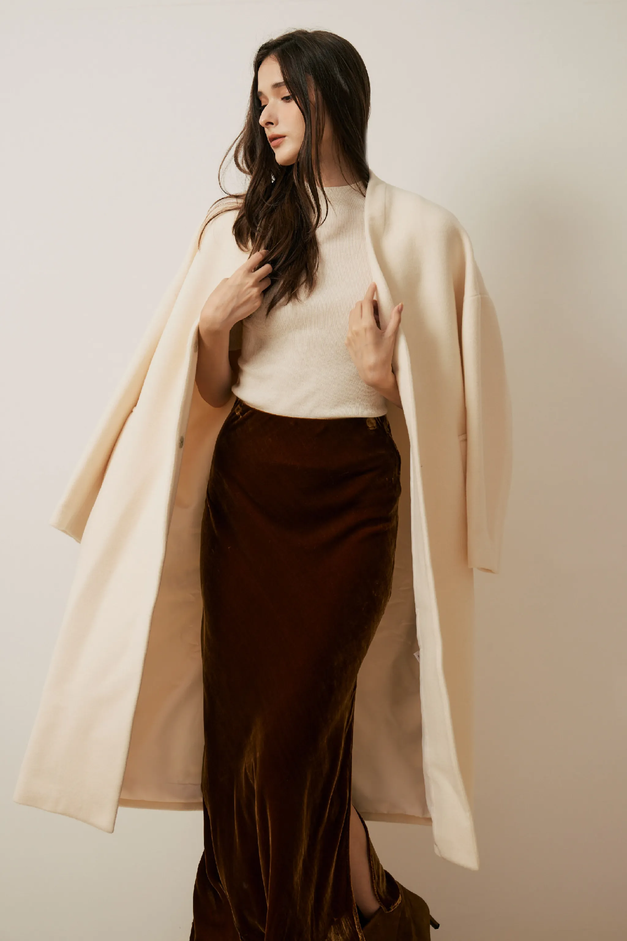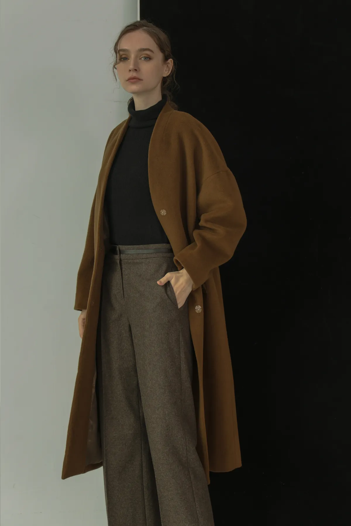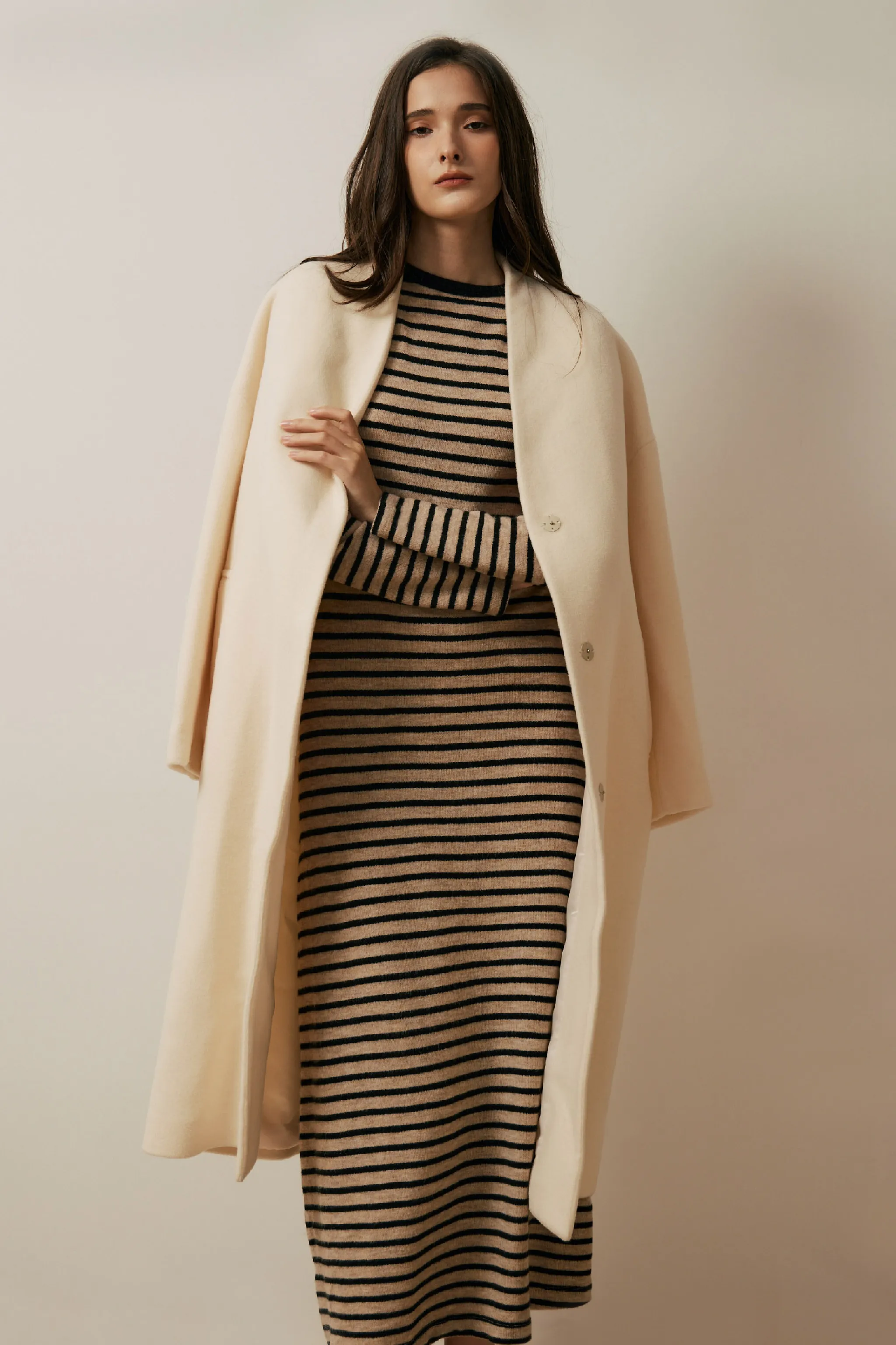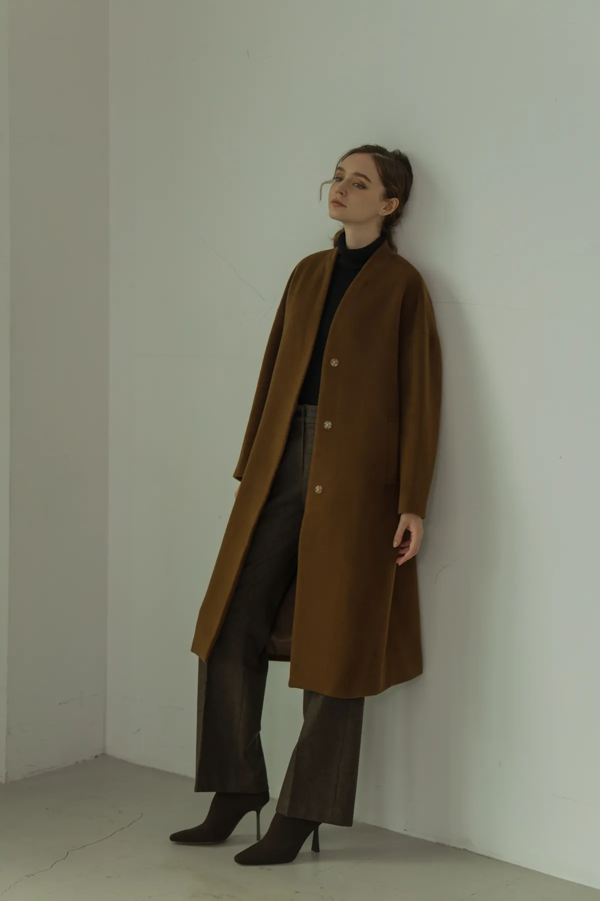 純羊毛無領壓釦長版大衣