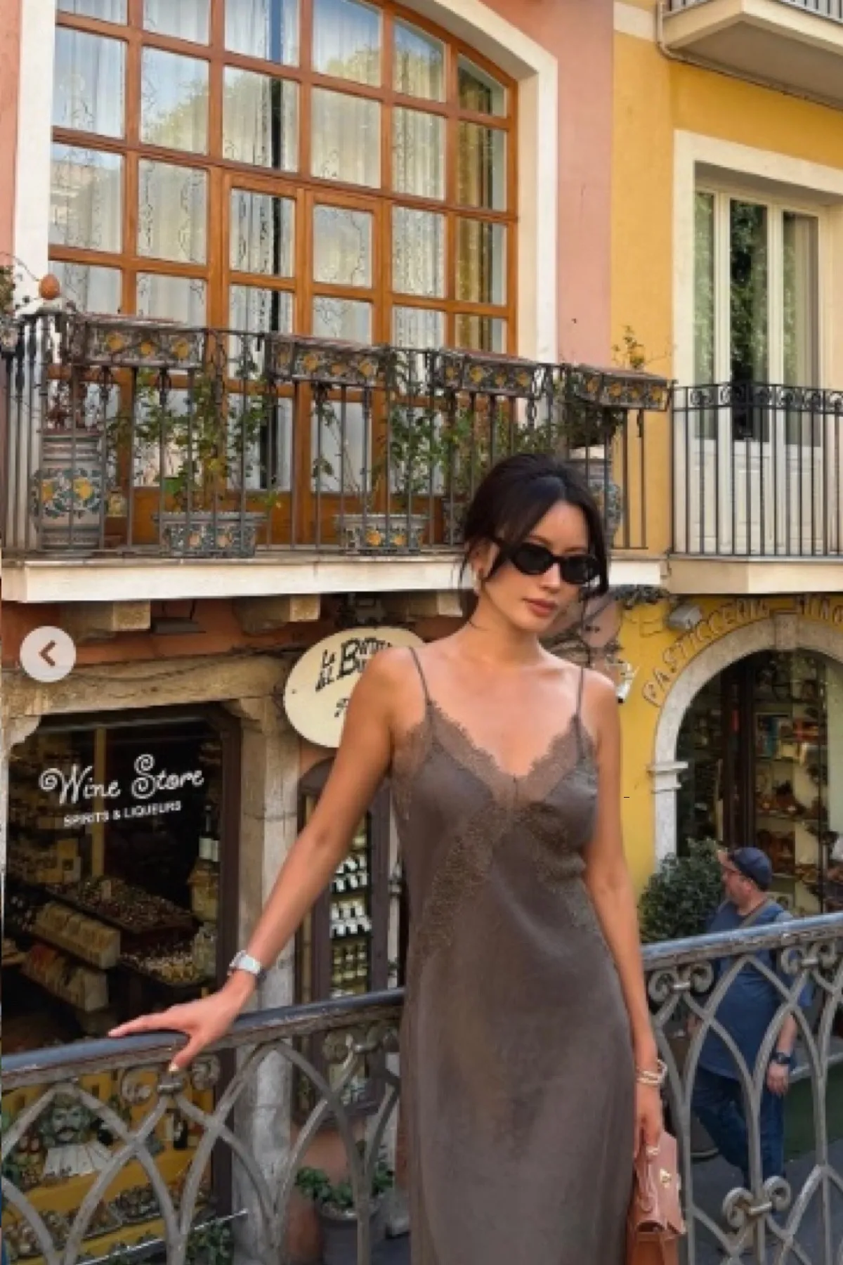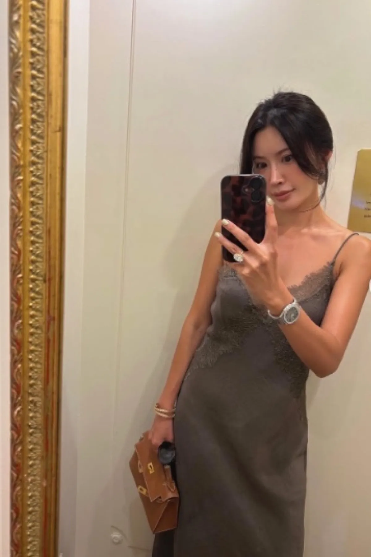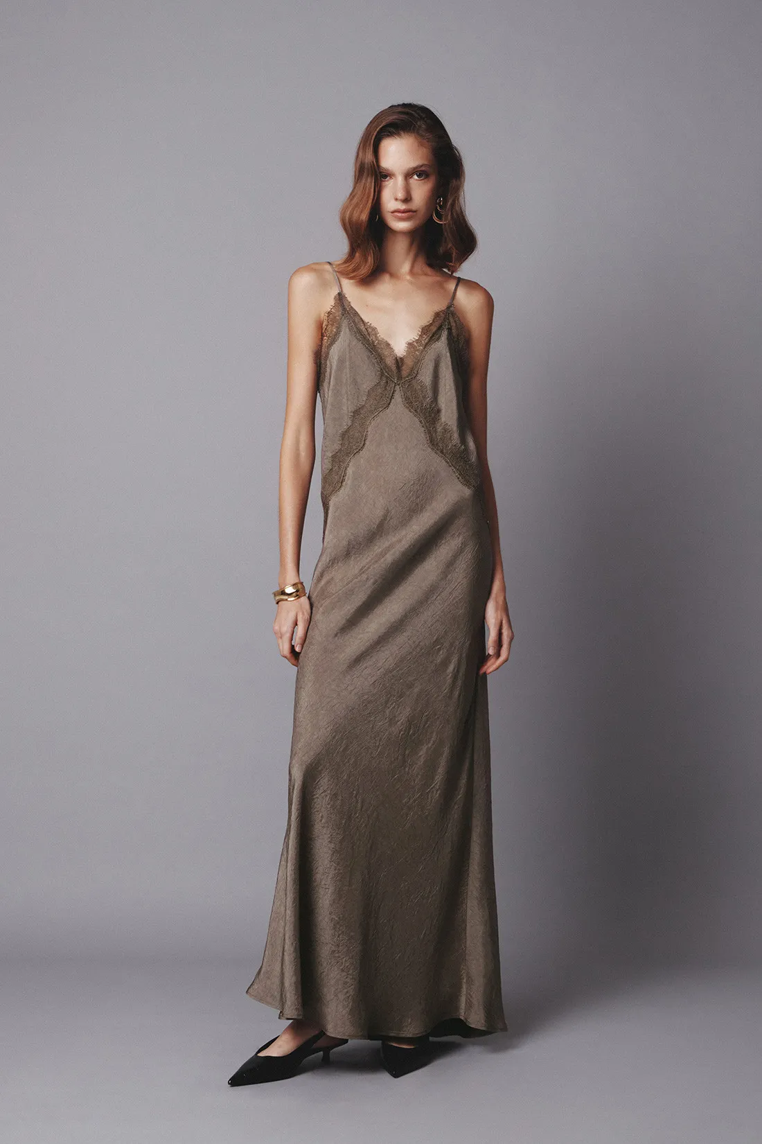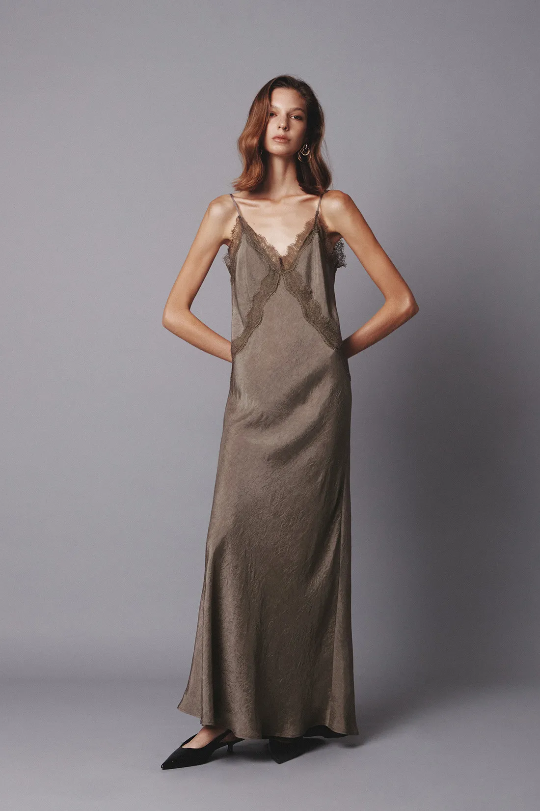 緞面V領蕾絲曲線細肩洋裝