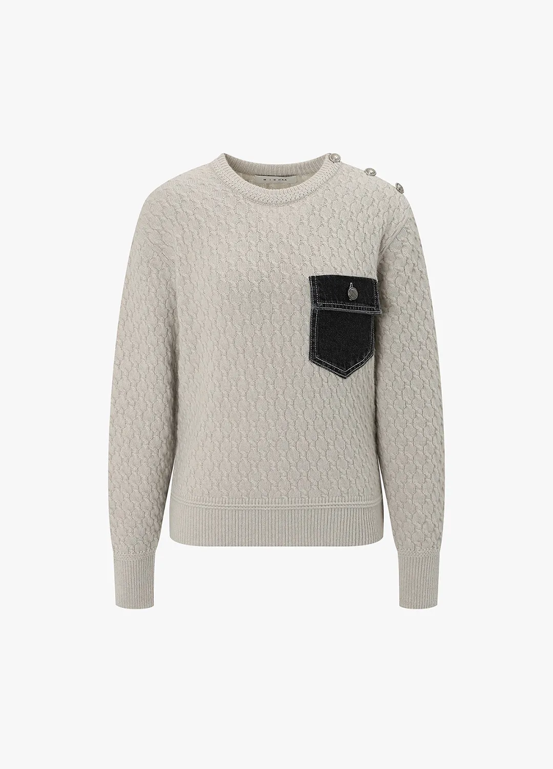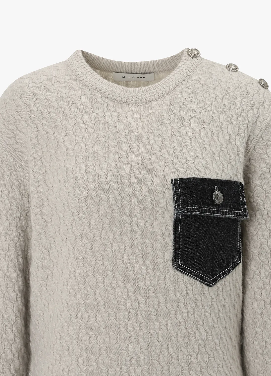 羊毛圓領三釦麻花丹寧口袋上衣