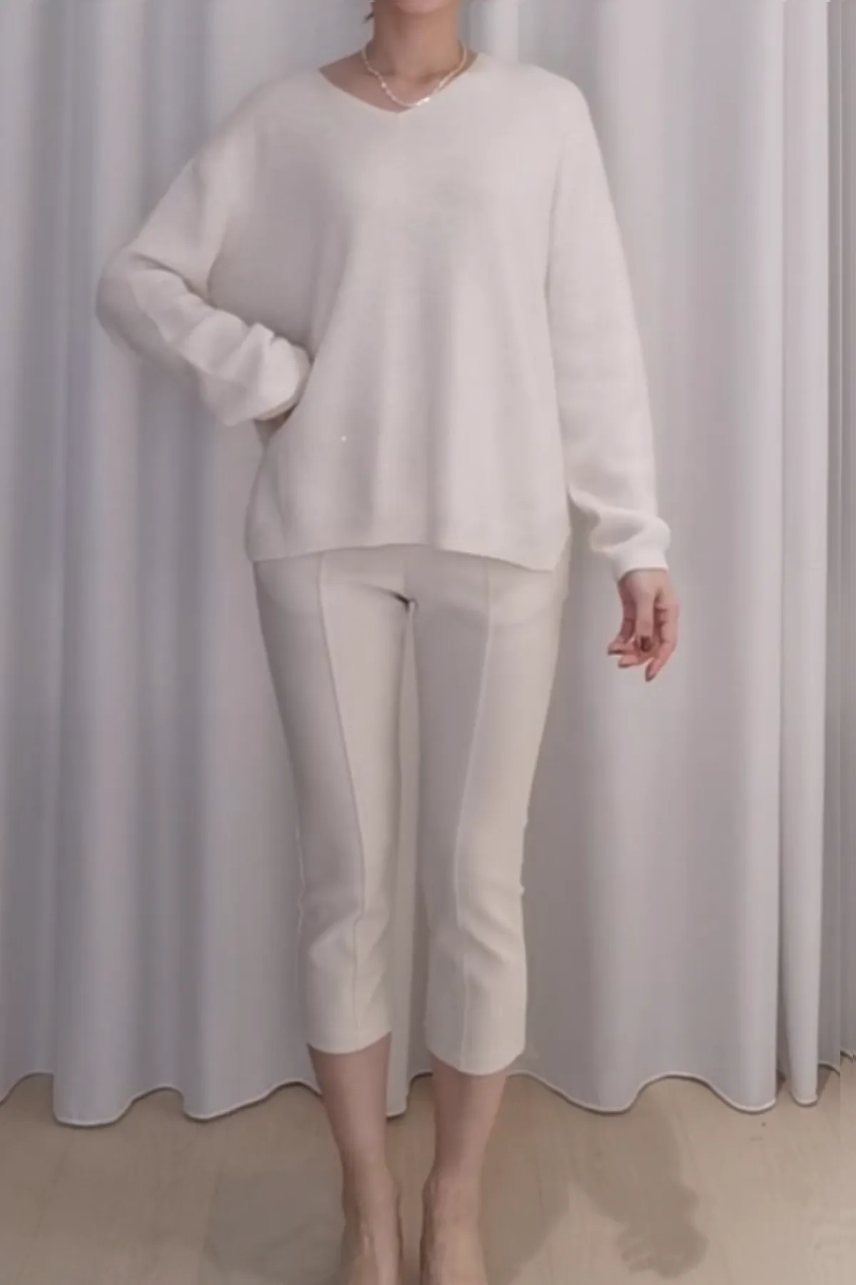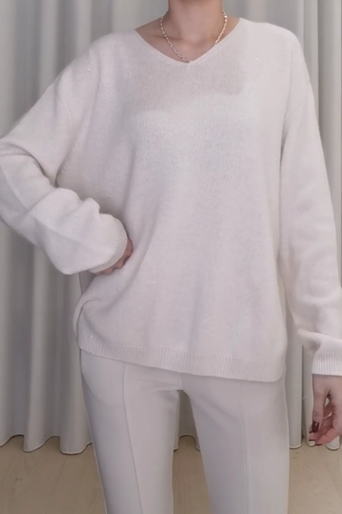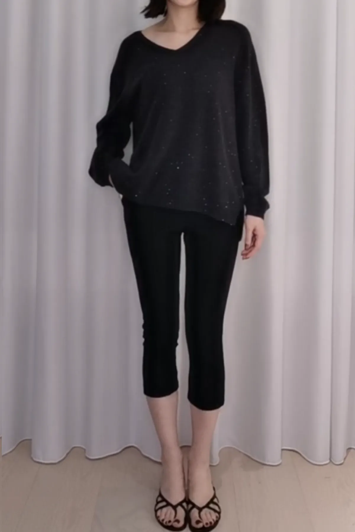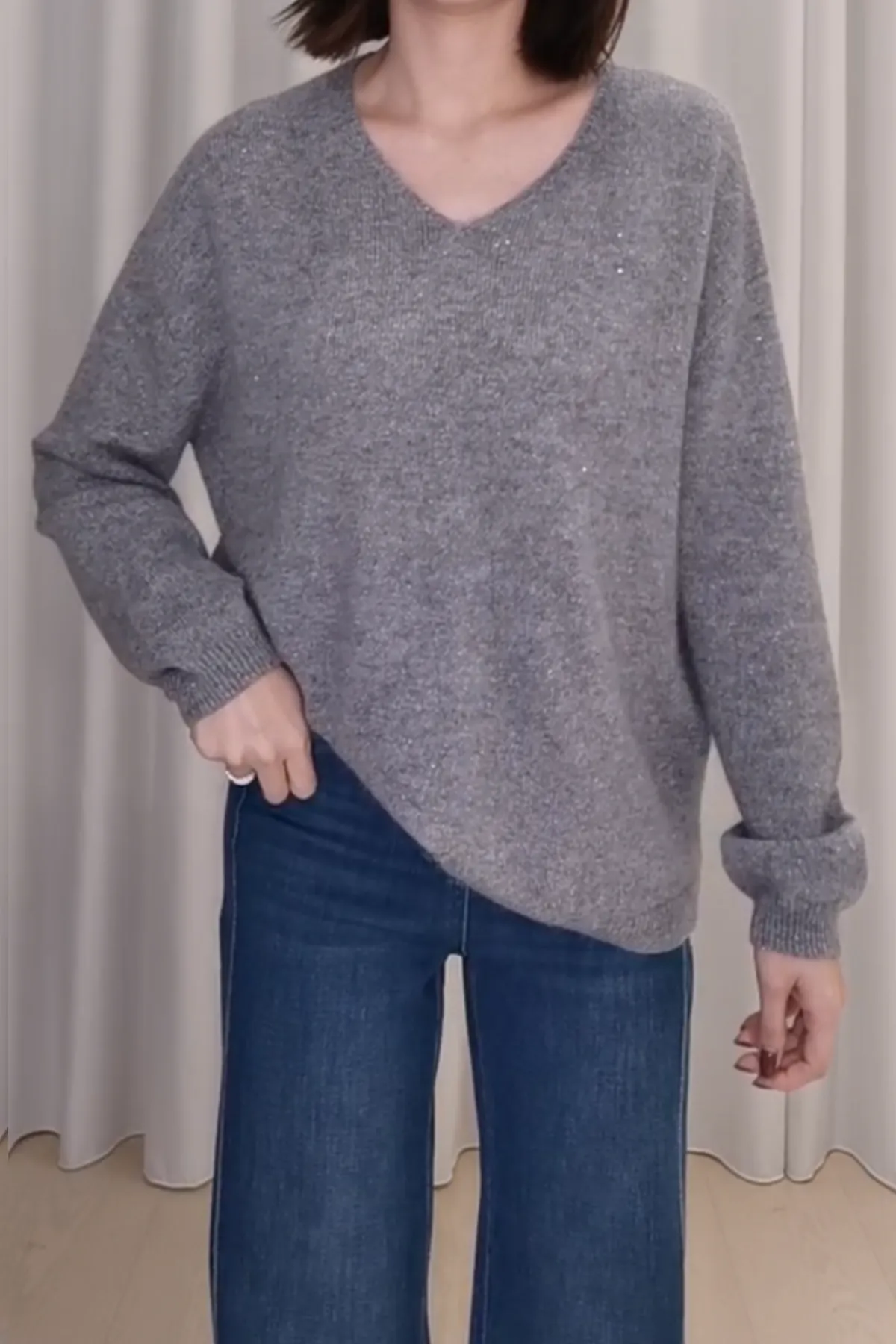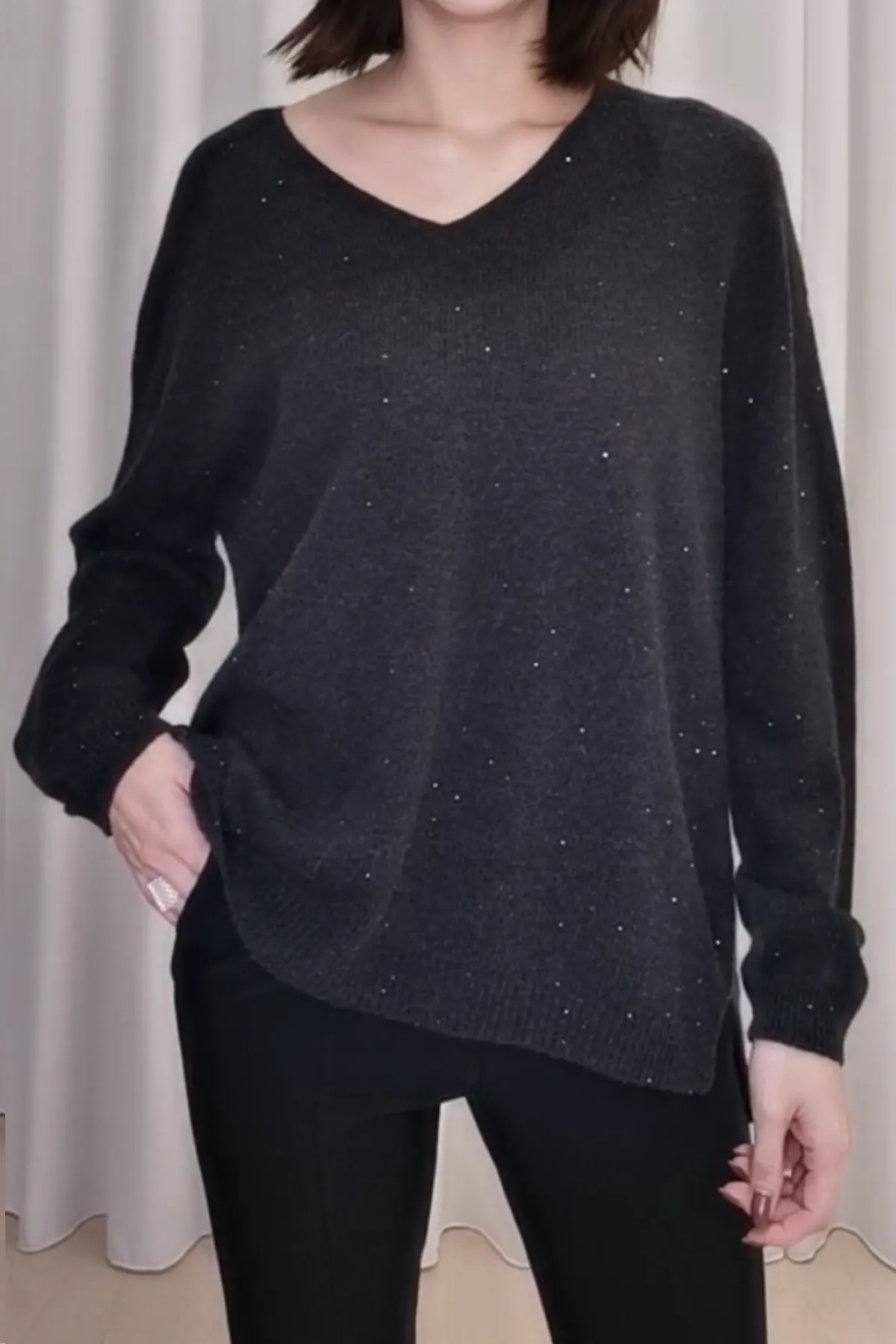 馬海毛V領亮片小開衩上衣