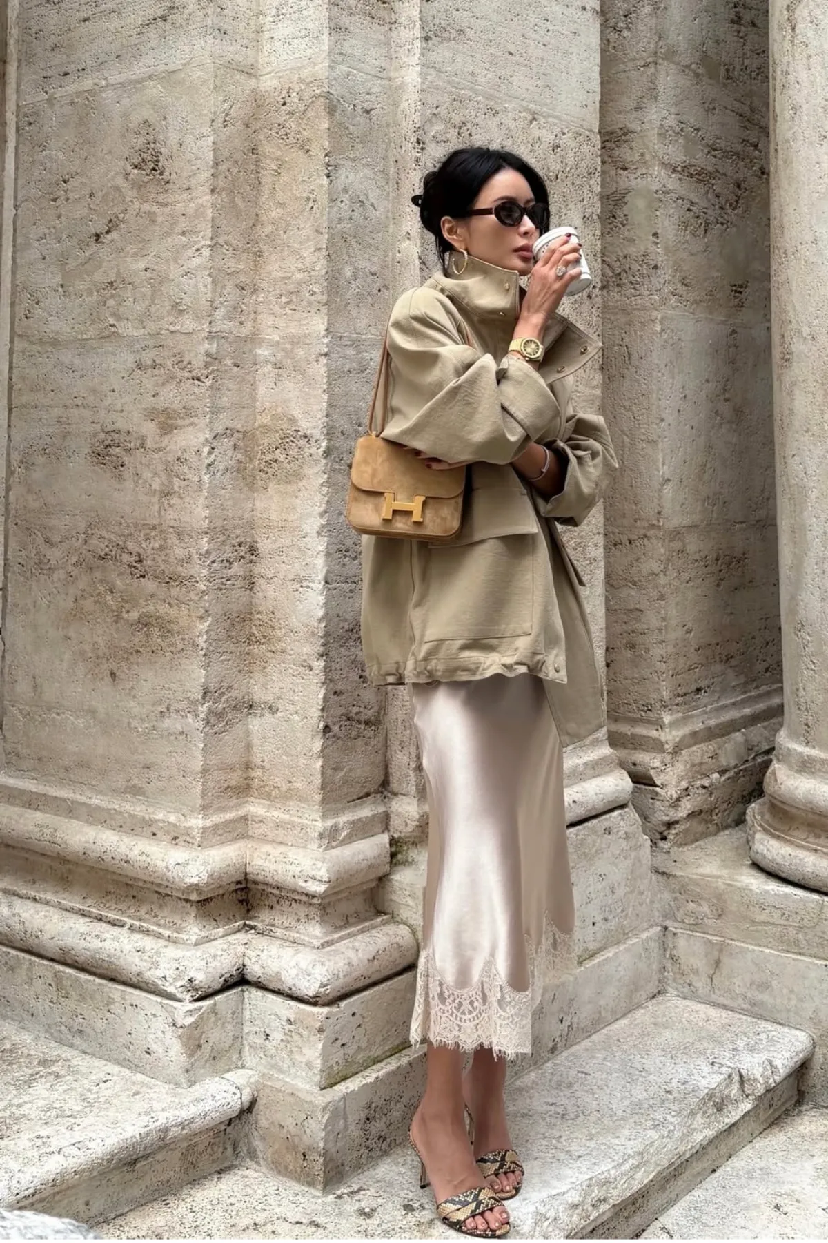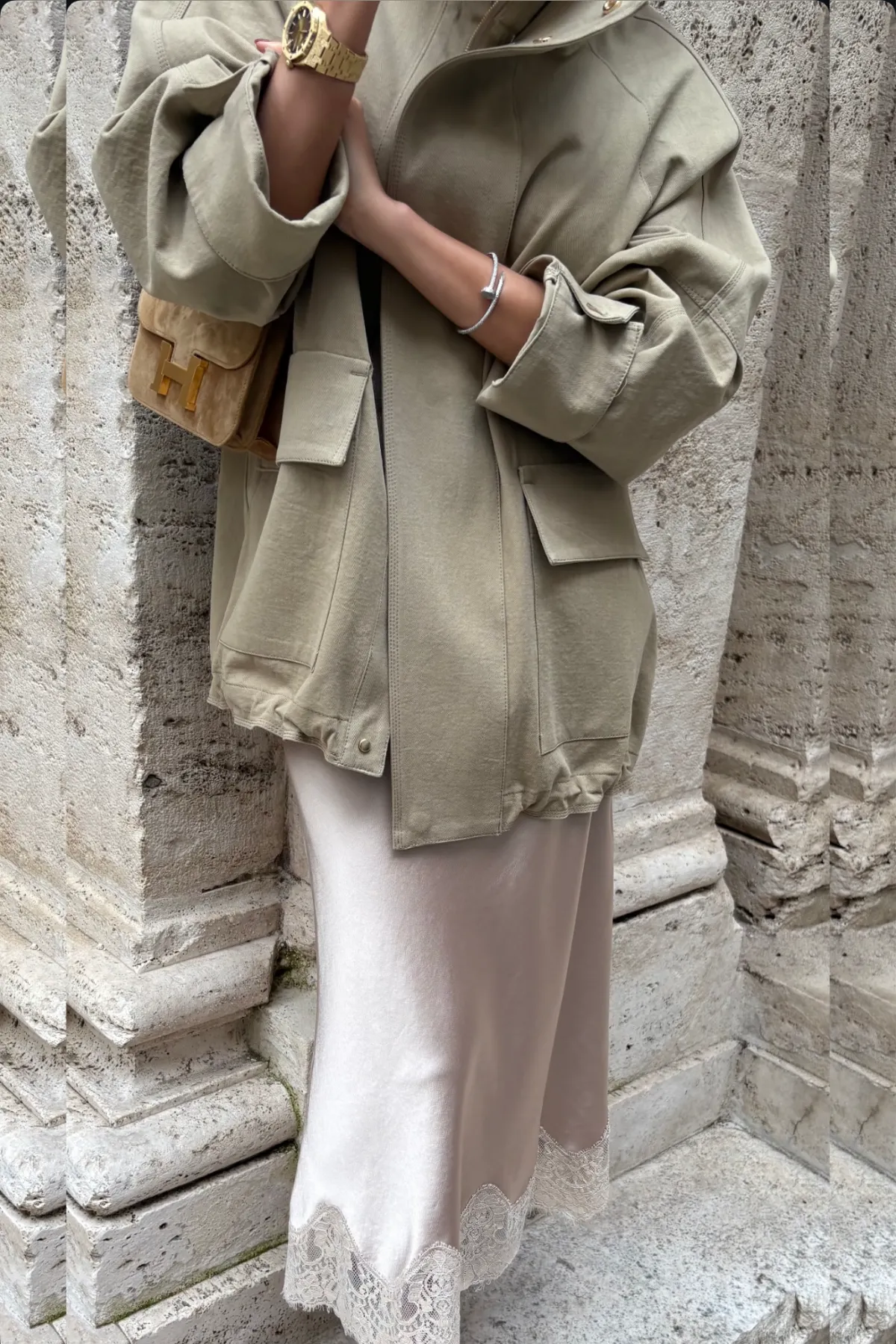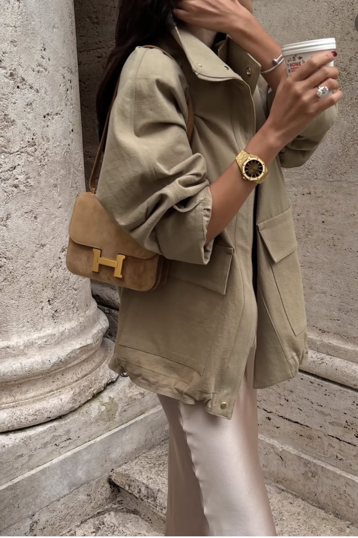 棉質立領雙蓋袋獵裝外套(卡其杏)