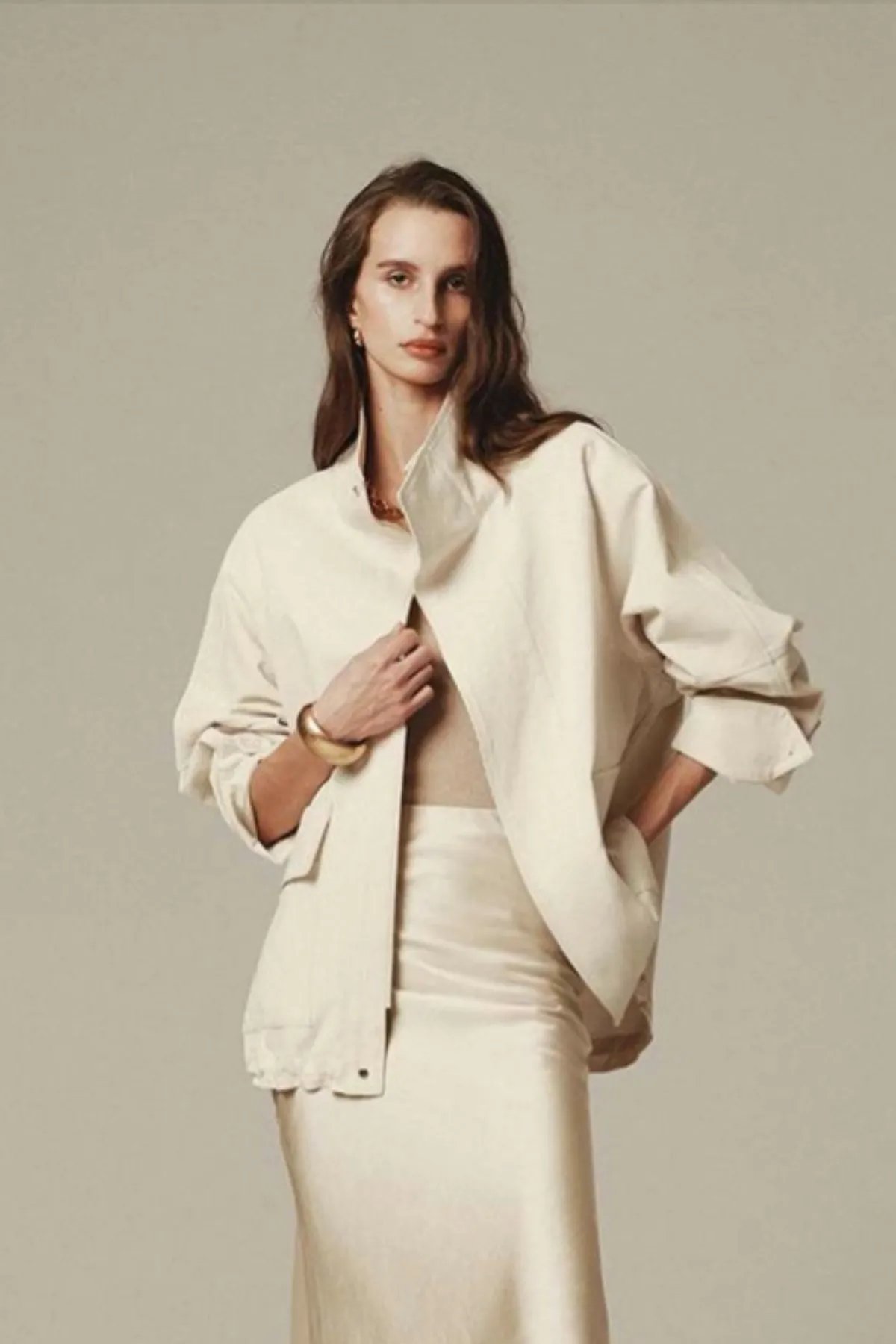 棉質立領雙蓋袋獵裝外套(奶油)