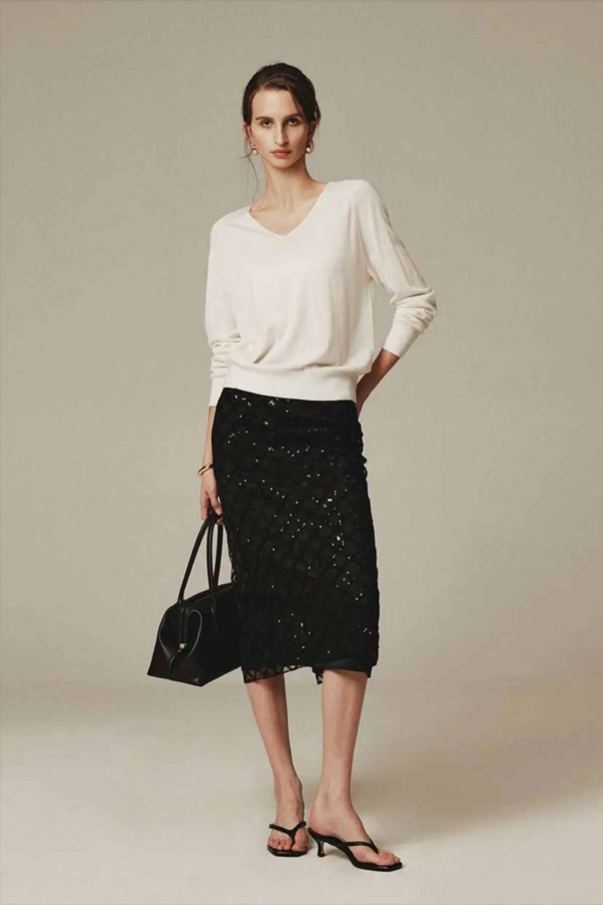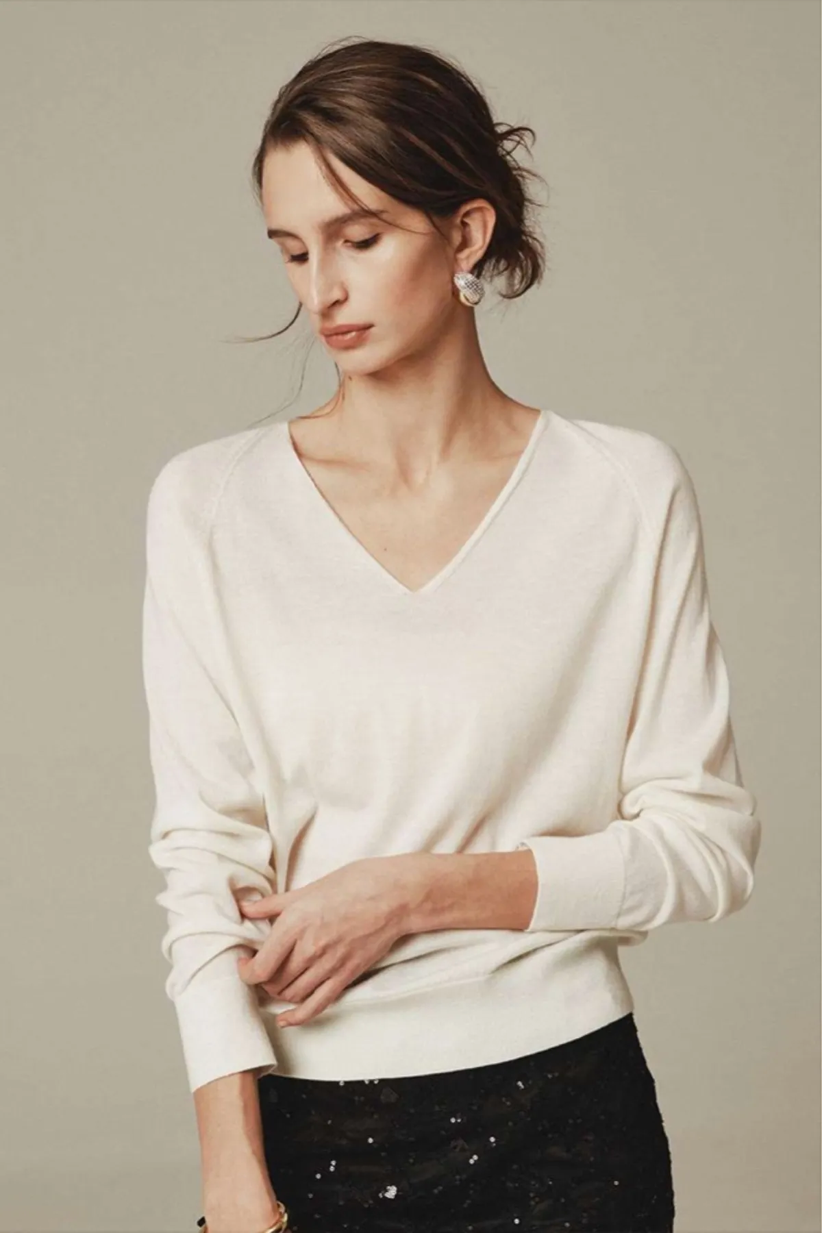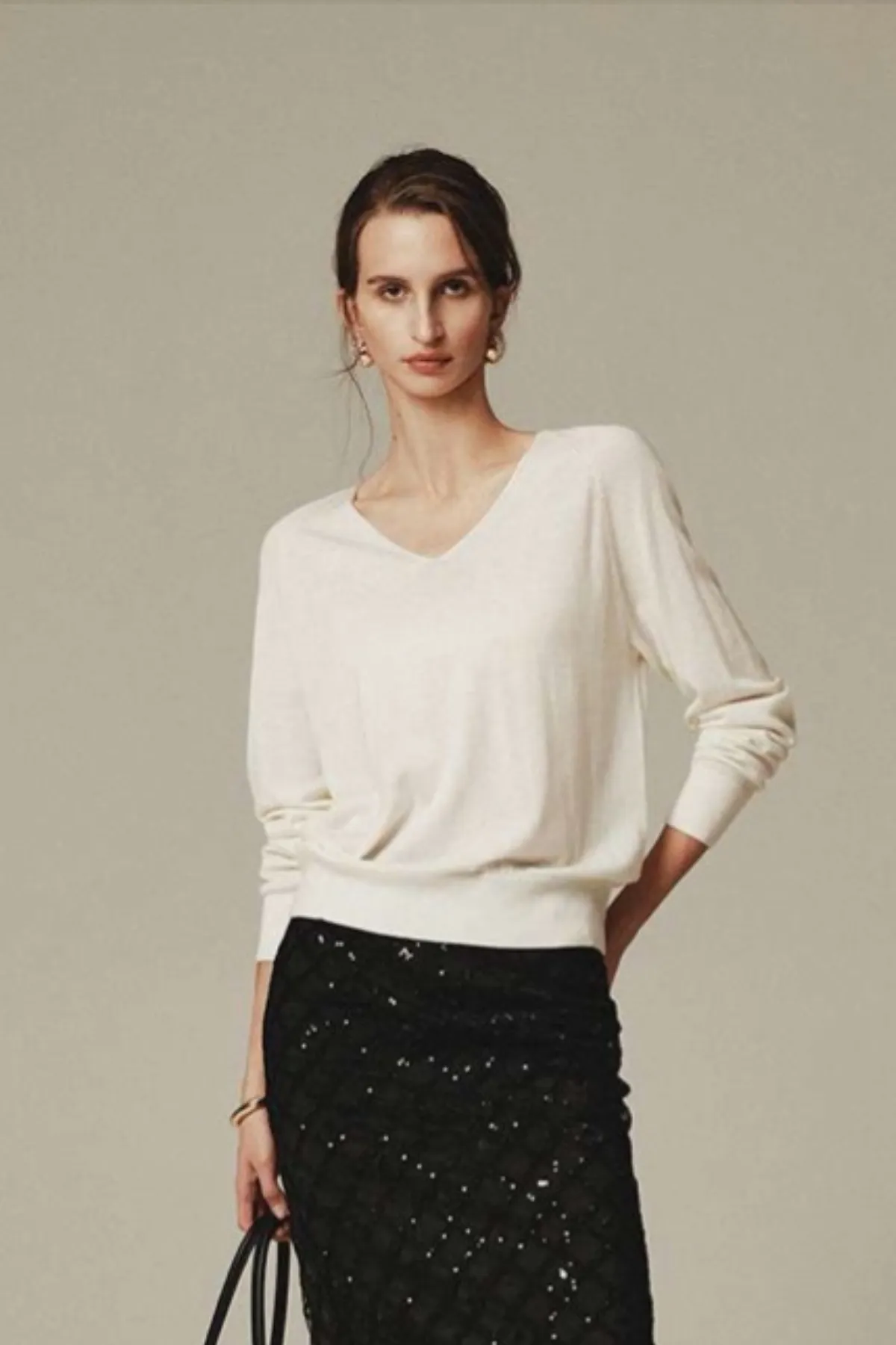 絲光美麗諾羊毛100%V領上衣(米白)