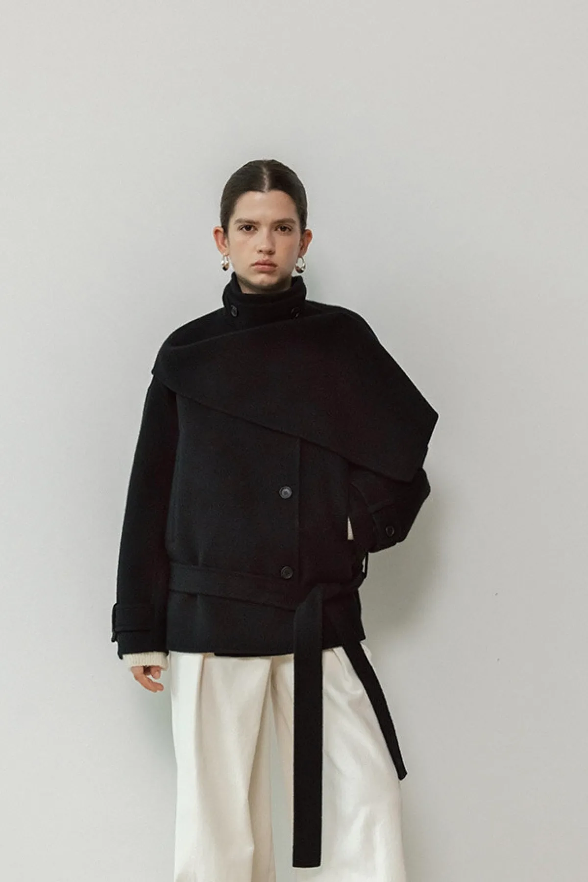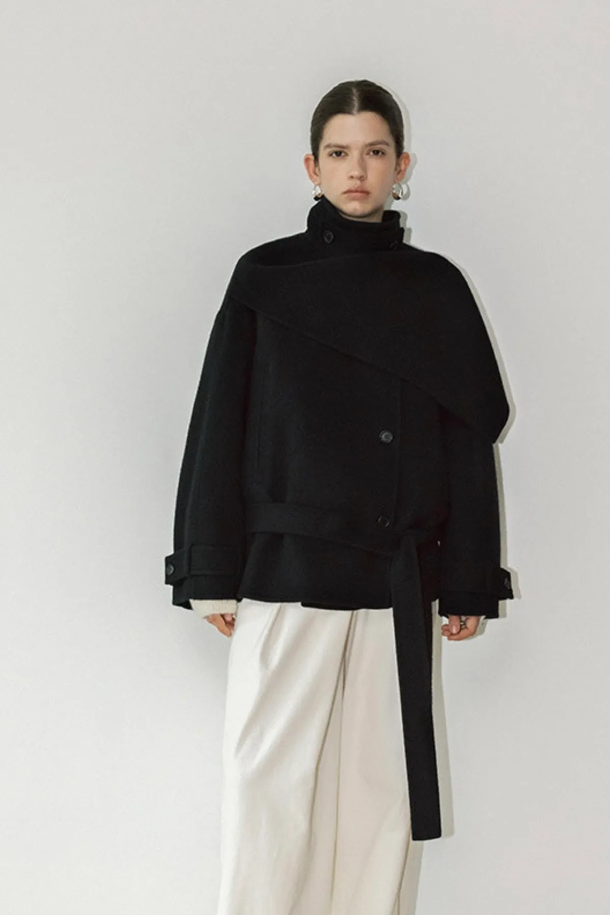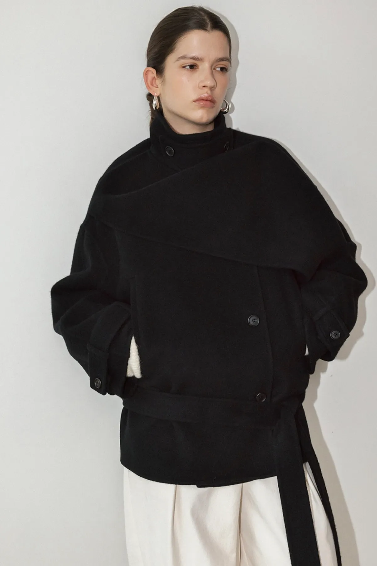多穿法羊絨手工領巾片排釦外套-附綁帶(黑)