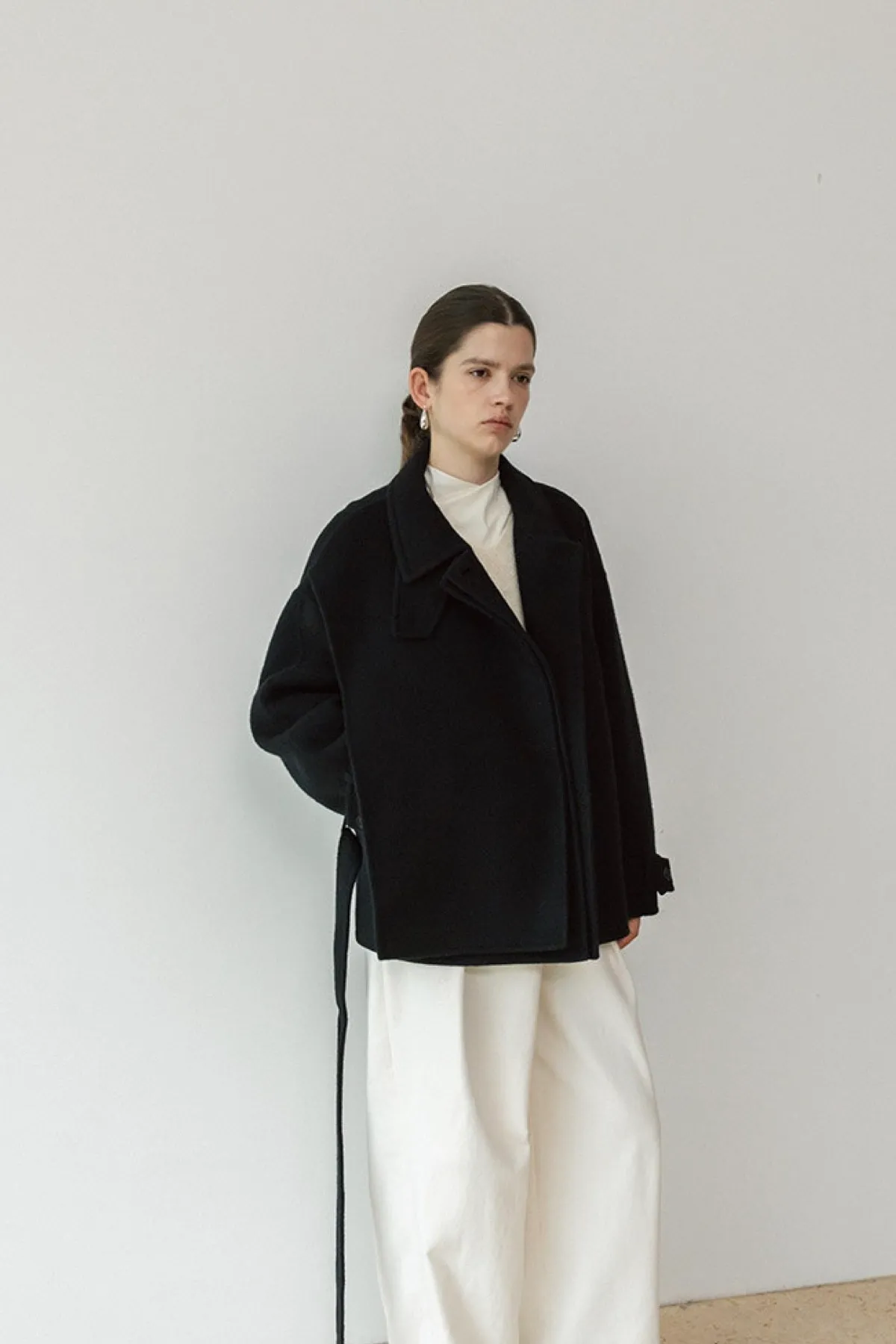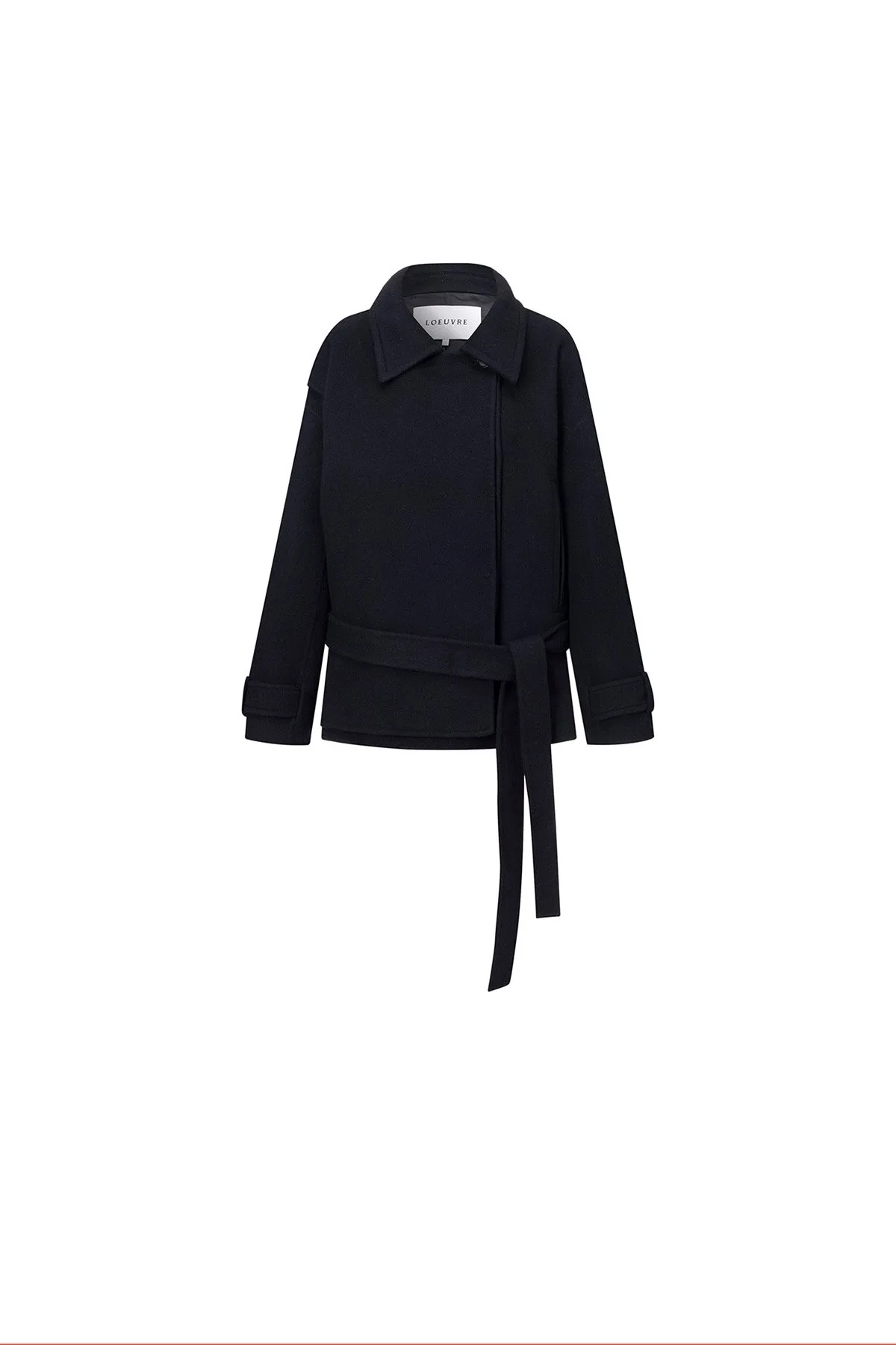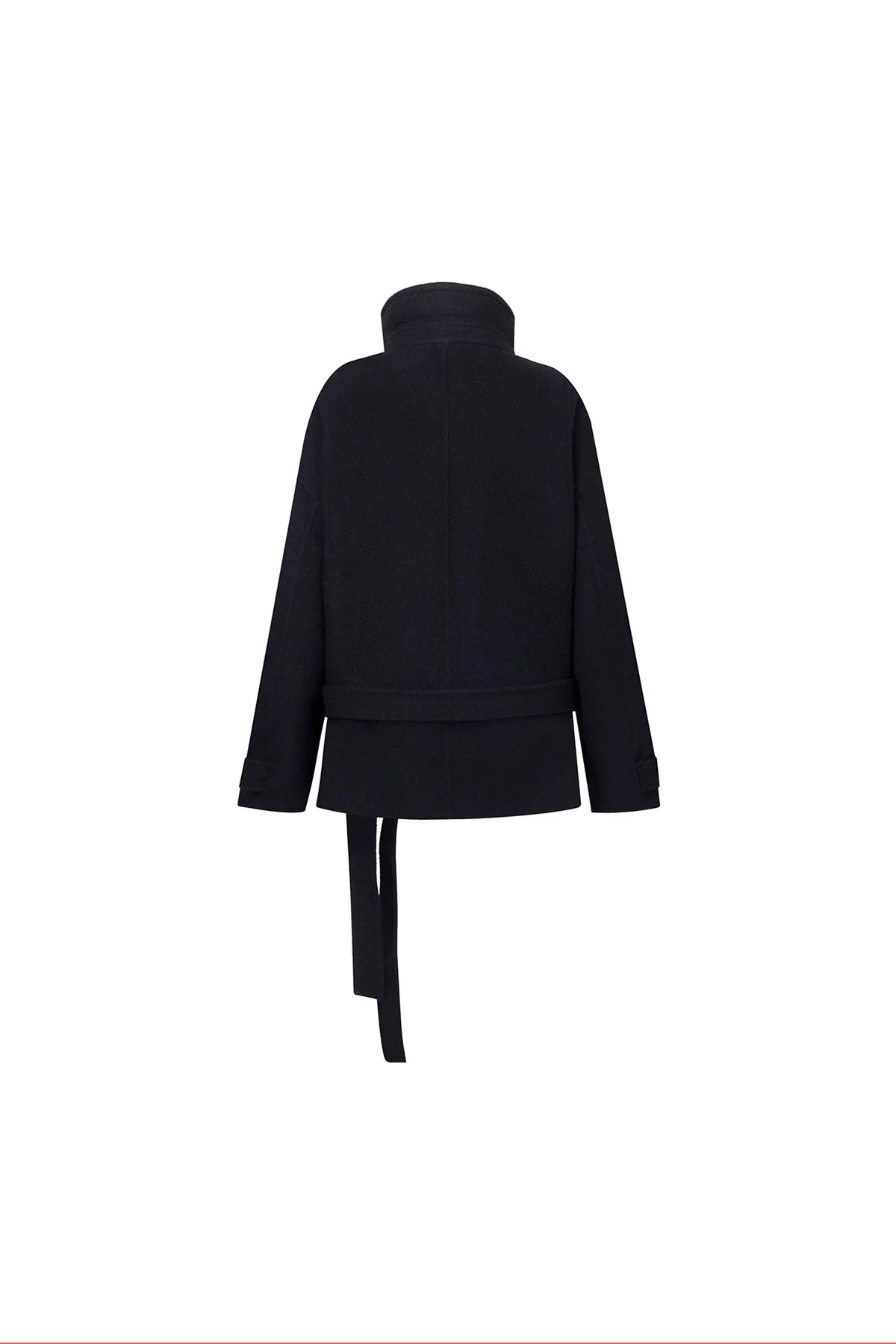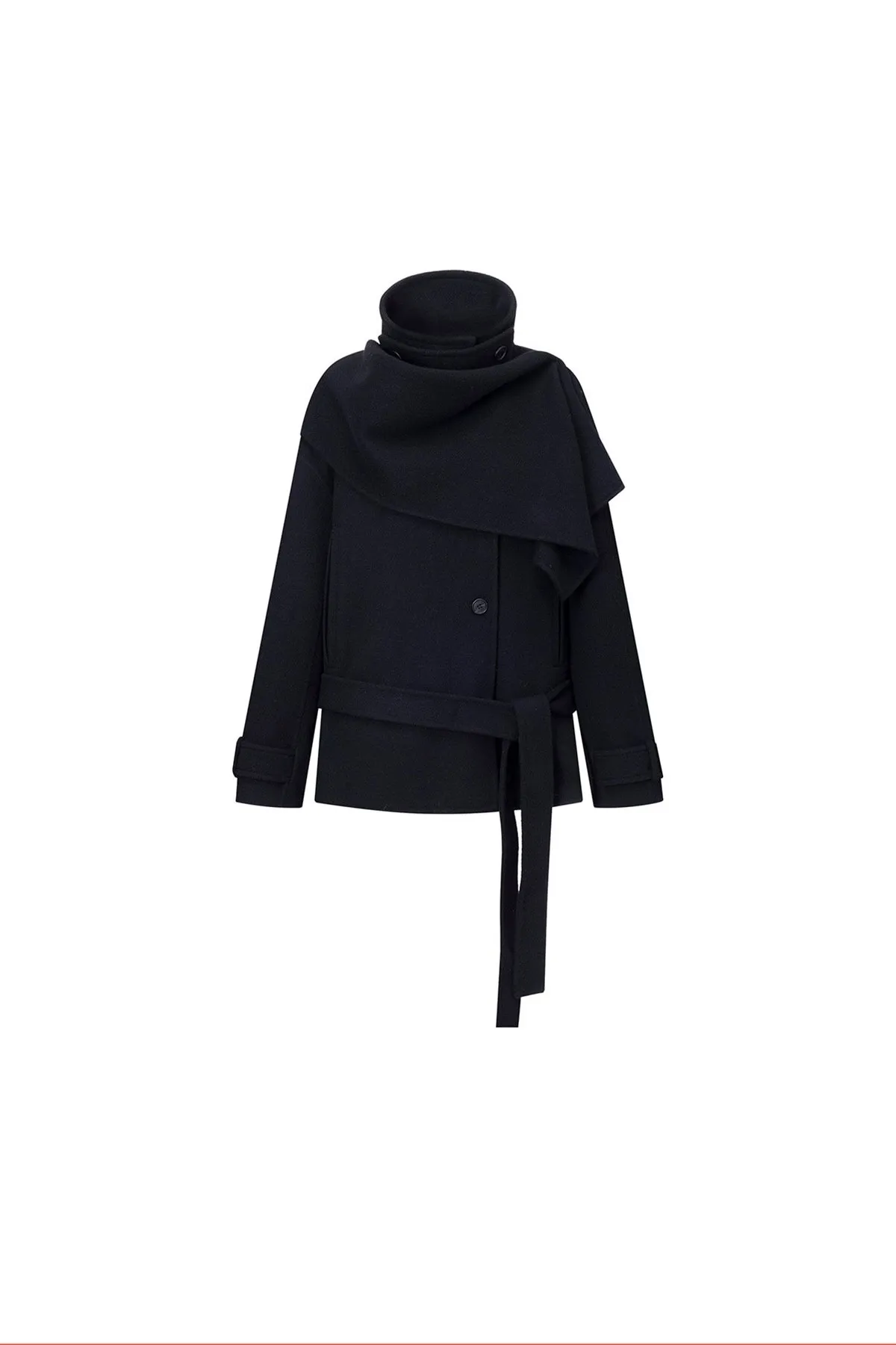 多穿法羊絨手工領巾片排釦外套-附綁帶(黑)